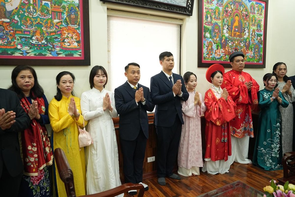 Vì lẽ đó, dưới sự gia hộ của mười phương chư Phật, sự chứng minh của Hòa thượng trụ trì Thích Bảo Nghiêm – Phó chủ tịch HĐTS kiêm Trưởng Ban hoằng pháp TƯ GHPGVN và chư tôn đức Tăng bản tự, sự tham dự của họ hàng hai bên gia đình, vào chiều ngày mùng 4 tháng 1 năm 2026, tức ngày 16 tháng 11 năm Ất Tỵ, ba đôi bạn trẻ Nguyễn Ngọc Phan - pháp danh Minh Phúc và Nguyễn Kim Cúc - pháp danh Diệu Thu, Nguyễn Minh Hiếu - pháp danh Minh Thuận và Phạm Phương Hoa - pháp danh Diệu Hương, Đinh Tấn An - pháp danh Định Bảo Tín và Lê Thị Kim Yến - pháp danh Hiền Từ Bảo đã kết duyên vợ chồng.