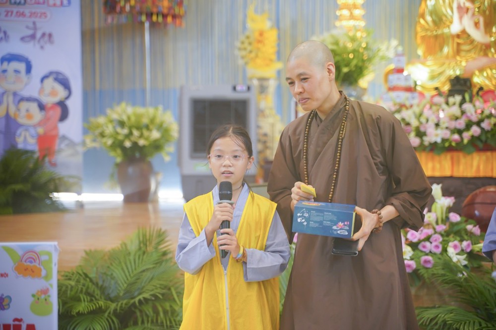 Tiếp nối là thời pháp thoại đầy ấm áp và gần gũi do Đại đức Thích Khải Thành chia sẻ với chủ đề “Trọn đạo làm con”. Với hình thức đối thoại sinh động giữa Thầy và các em, buổi chia sẻ đã trở thành một dòng chảy yêu thương, đưa các em trở về với suối nguồn của lòng hiếu kính. Qua lời dạy của Đức Phật, Thầy nhấn mạnh rằng: hiếu đạo không chỉ là lời nói hay hành động, mà trước hết là sự hiểu và thương trong trái tim – thương cha mẹ bằng sự lắng nghe, cảm thông, và biết ơn sâu sắc. Những câu hỏi nhẹ nhàng về công lao sinh thành và dưỡng dục đã giúp các em gỡ bỏ những khúc mắc trong mối quan hệ gia đình, để từ đó khởi lên tâm nguyện làm người con ngoan, sống đúng với đạo làm con.