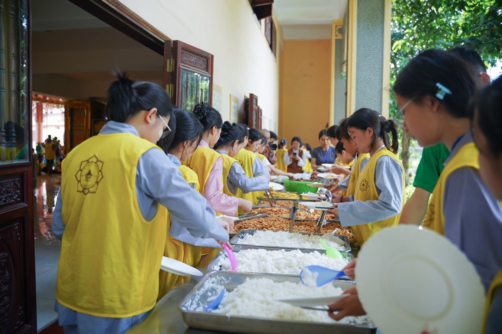 Đến giờ thụ trai, các em được quý Thầy Cô hướng dẫn thực tập ăn cơm trong chính niệm. Trong không gian thiền vị của trai đường, các em đồng tụng bài kệ quán niệm, tưởng nhớ đến ân đức Tam Bảo, tổ tiên, cha mẹ, đất trời và những người đã góp phần tạo nên bát cơm thơm ngọt hôm nay. Mỗi thìa cơm đưa vào miệng là một sự quán chiếu, là lời tri ân gửi đến muôn loài.