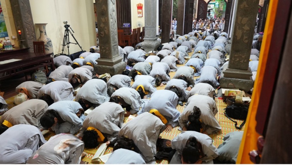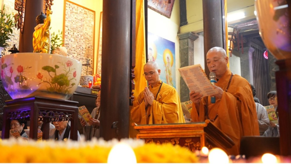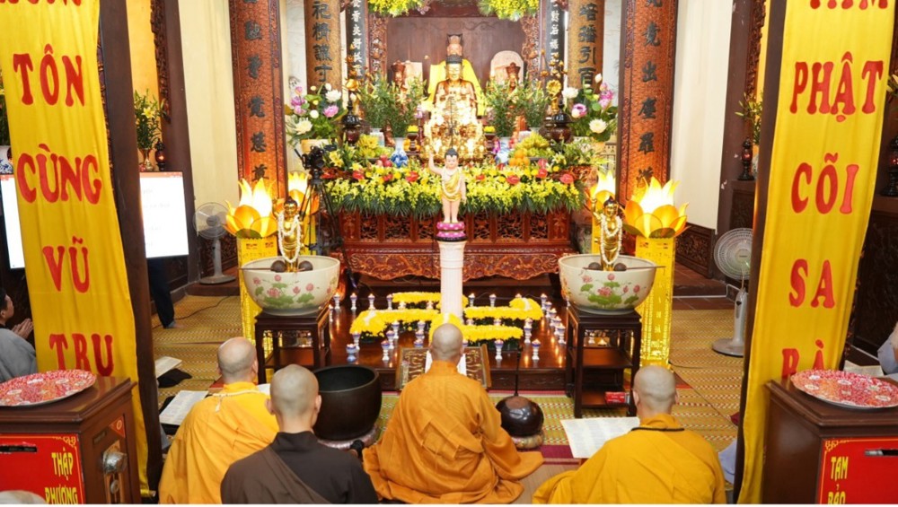 Trong không khí thiêng liêng, chư tôn đức cùng toàn thể đại chúng đã cùng nhau cử hành lễ niêm hương bạch Phật, dâng trọn lòng thành kính lên Đức Bản Sư Thích Ca Mâu Ni. Trong khói hương trầm quyện tỏa, từng tiếng kệ lời kinh như đưa tâm mọi người trở về nguồn cội giác ngộ. Bằng sự nhất tâm, thanh tịnh, đại chúng trang nghiêm thực hiện nghi thức tắm Phật, từng gáo nước tưới lên kim thân Đức Phật sơ sinh như gột rửa phiền não, vun bồi thiện lành. Từng lời niệm hồng danh Đức Phật âm vang khắp chốn thiền môn, mang lại niềm an lạc cho những người tham dự, khép lại buổi lễ Phật đản thành tựu viên mãn.