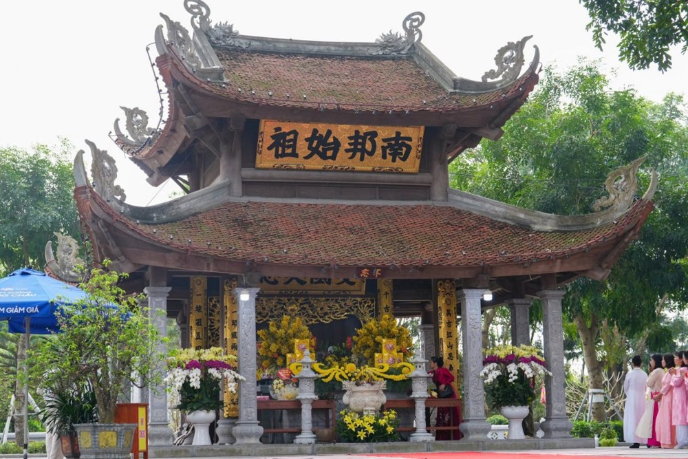 Điểm dừng chân đầu tiên của đoàn hành hương là Lăng Kinh Dương Vương. Tại đây, Đại đức Thích Quảng Hiếu đã cùng các Phật tử ôn lại nguồn gốc, lịch sử của người Việt thông qua truyền thuyết về Kinh Dương Vương – Ông Tổ của dân tộc Việt. Theo truyền thuyết, Kinh Dương Vương là Tổ thứ nhất của dân tộc Việt Nam, khai sinh họ Hồng Bàng, dựng nước Xích Quỷ, tiền thân của Nhà nước Văn Lang. Theo “Đại Việt sử ký toàn thư”, Kinh Dương Vương húy là Lộc Tục; sinh con là Sùng Lãm, gọi là Lạc Long Quân. Lạc Long Quân kết duyên cùng Âu Cơ, sinh ra trăm người con trai. Ấy là tổ tiên của Bách Việt, suy tôn người trưởng làm Hùng Vương, nối ngôi vua, dựng nước gọi là Văn Lang. Công đức của các Vua Hùng, nhất là Tổ Kinh Dương Vương, được thể hiện qua bốn chữ “Nam Thiên Triệu Tổ” tại Đền Thượng – nơi đoàn hành hương tu học.