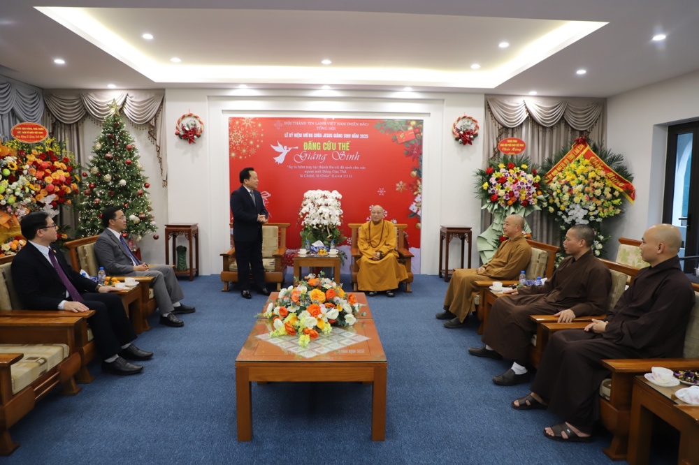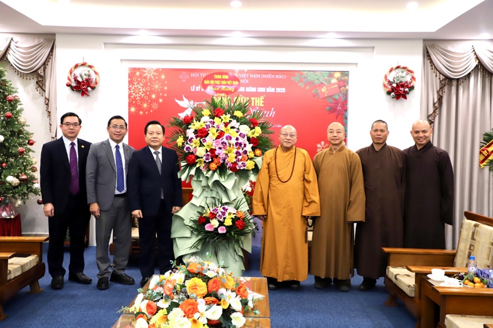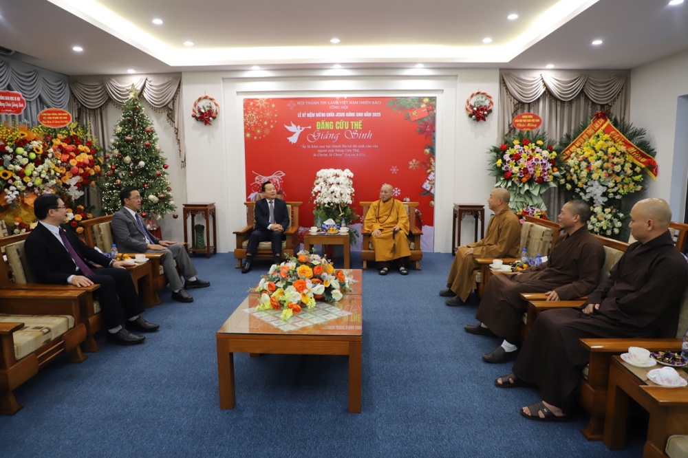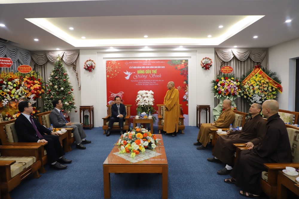Nhân dịp này phái đoàn TƯ GHPGVN đã gửi tặng lẵng hoa chúc mừng trong niềm hỷ lạc vô biên, gửi lời chúc mừng Tổng hội Thánh tin lành Việt Nam (miền Bắc) đón một mùa Giáng sinh an lành và hạnh phúc.