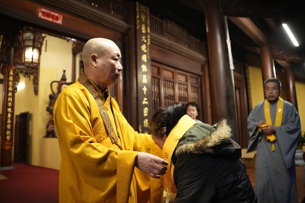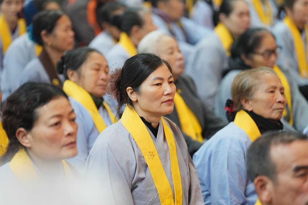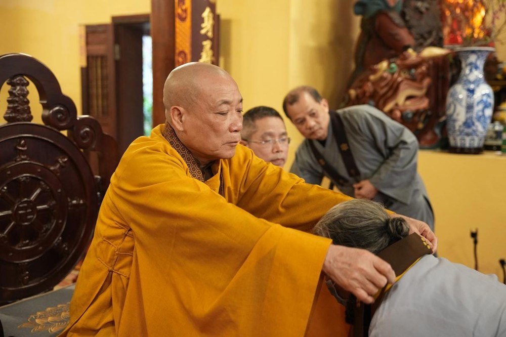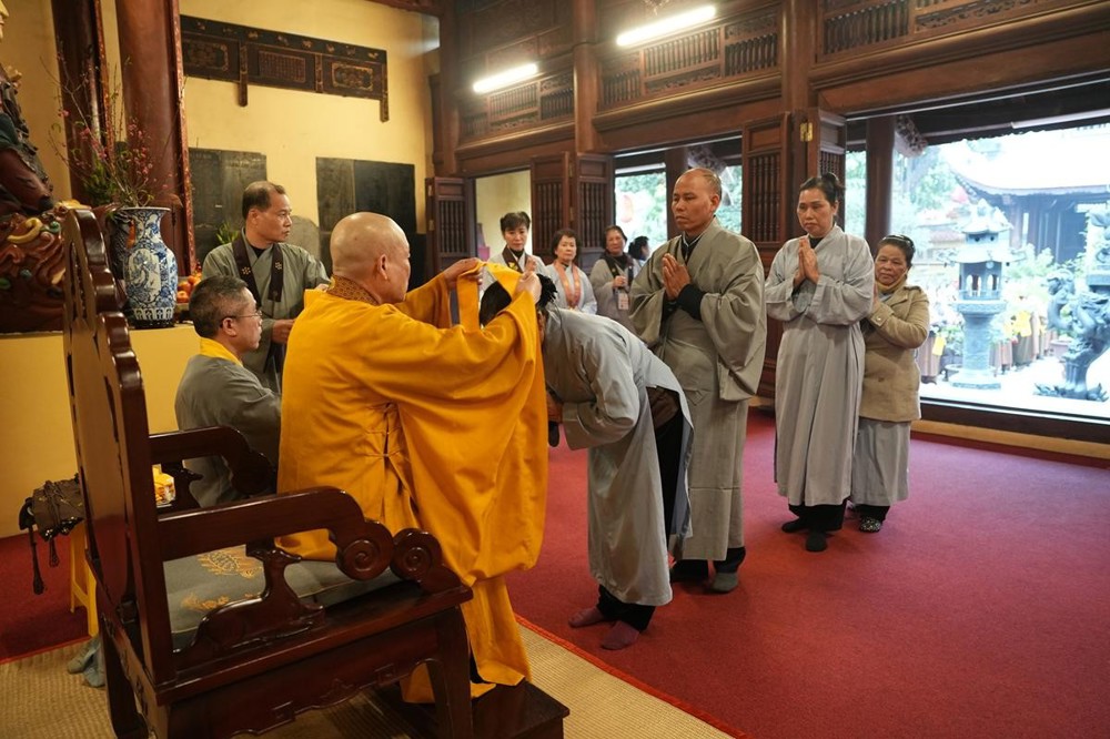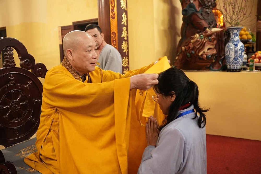 Cùng lúc đó, trong không gian thanh tịnh nơi Tam Bảo, Hòa thượng Thích Bảo Nghiêm đã cử hành nghi thức nâng y cho các Phật tử. Nghi thức được thực hiện trong sự im lặng trang nghiêm: Thầy truyền trao pháp Y không lời, người thọ nhận chắp tay búp sen, cúi mình an trú. Chính sự lặng yên ấy đã tạo nên một sự thiêng liêng, nhiệm mầu, nối liền tâm người thọ pháp với tâm Thầy, để pháp được truyền bằng sự tỉnh thức và thanh tịnh nội tâm.