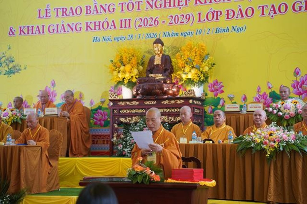 Đồng thời Hoà thượng gửi lời chào mừng và sách tấn đối với các giảng sinh khoá III “hôm nay chúng ta cũng chào đón gần 90 Tăng Ni giảng sinh Khóa III chính thức bước vào con đường đào tạo giảng sư. Ba năm sắp tới không chỉ là quá trình tích lũy tri thức mà còn là hành trình rèn luyện nội tâm và nuôi dưỡng lý tưởng lớn. Để trở thành một giảng sư xứng đáng với sứ mệnh hoằng pháp, cần hội đủ ba nền tảng vững chắc: