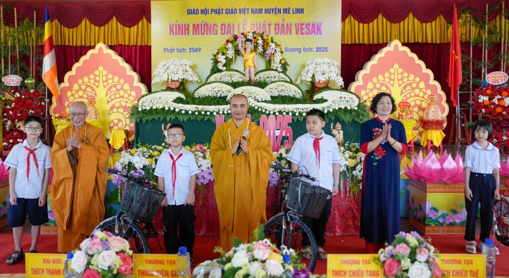 Đặc biệt, nhân tháng Phật đản, noi theo gương hạnh Từ Bi của Đức Thế Tôn, Tăng Ni Phật giáo huyện Mê Linh đã trao tặng 1 ngôi nhà đại đoàn kết trị giá 50 triệu đồng. Cũng trong buổi lễ, chư Tăng Phật tử Chùa Khai Quang có 15 món quà trao tặng đến các em học sinh có thành tích xuất sắc trong năm 2024 – 2025 của trưởng tiểu học Tiền Phong A, Tiền Phong B. Đây là những món quà thiết thực của BTS huyện Mê Linh và chùa Khai Quang nhằm hỗ trợ người dân và các em học sinh vươn lên trong cuộc sống