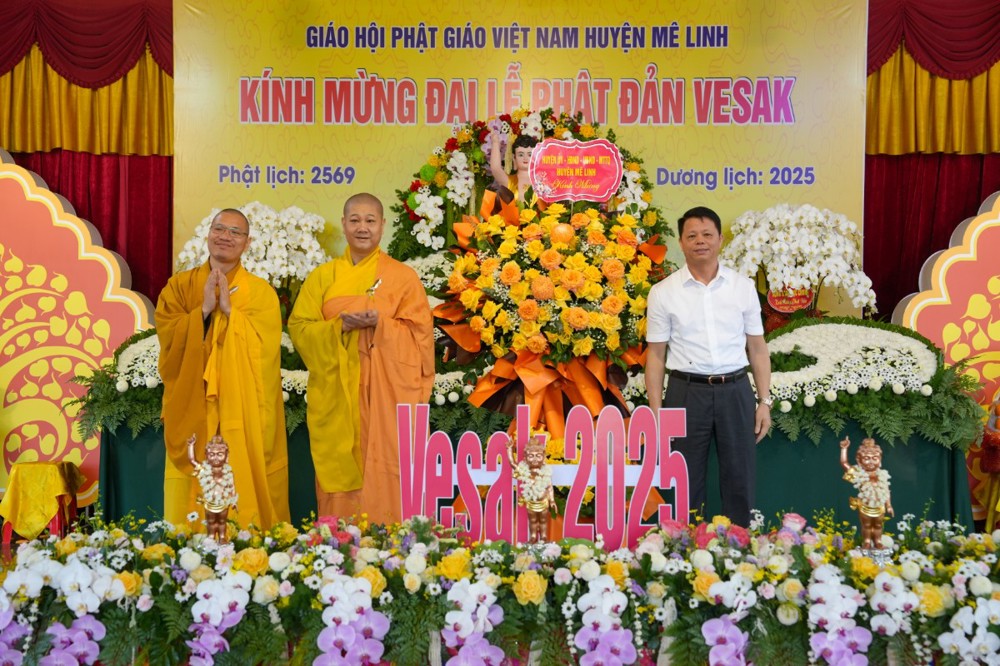 Nhân dịp đại lễ Phật đản huyện Mê Linh, Ông Lê Văn Khương, Huyện uỷ viên, Phó Chủ tịch UBND huyện Mê Linh đã đại diện cho chính quyền chúc mừng Tăng Ni, Phật tử huyện Mê Linh nhân dịp Phật đản PL. 2569 – DL. 2025. Bên cạnh đó, ông Lê Văn Khương cũng như chính quyền huyện Mê Linh luôn đánh giá cao hoạt động Phật sự của BTS Phật giáo huyện trong các công tác như hoằng pháp, từ thiện xã hội, tiếp tục củng cố khối đại đoàn kết toàn dân. Ông trân trọng cảm ơn sự đồng hành của Phật giáo huyện Mê Linh với tinh thần của đạo Phật: “Đoàn kết – Hoà hợp, Trưởng dưỡng đạo tâm – trang nghiêm Giáo hội”. Bên cạnh đó, tính từ năm 2021 đến nay, huyện đã tu bổ, tôn tạo, xây dựng mới gần 40 công trình di tích đình, chùa với tổng kinh phí là 748 tỉ đồng. Trong thời gian tới, ông sẽ tiếp tục thực hiện kế hoạch vì đây là hoạt động thiết thực nhất, thể hiện sự nỗ lực, quan tâm của các cấp chính quyền đối với Tôn giáo, đảm bảo cơ sở Tôn giáo được khang trang, tạo điều kiện thuận lợi cho các tăng ni, Phật tử và Nhân dân thực hành tín ngưỡng truyền thống.