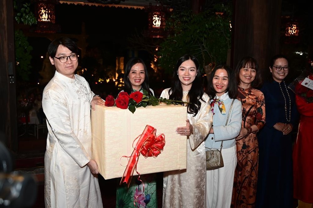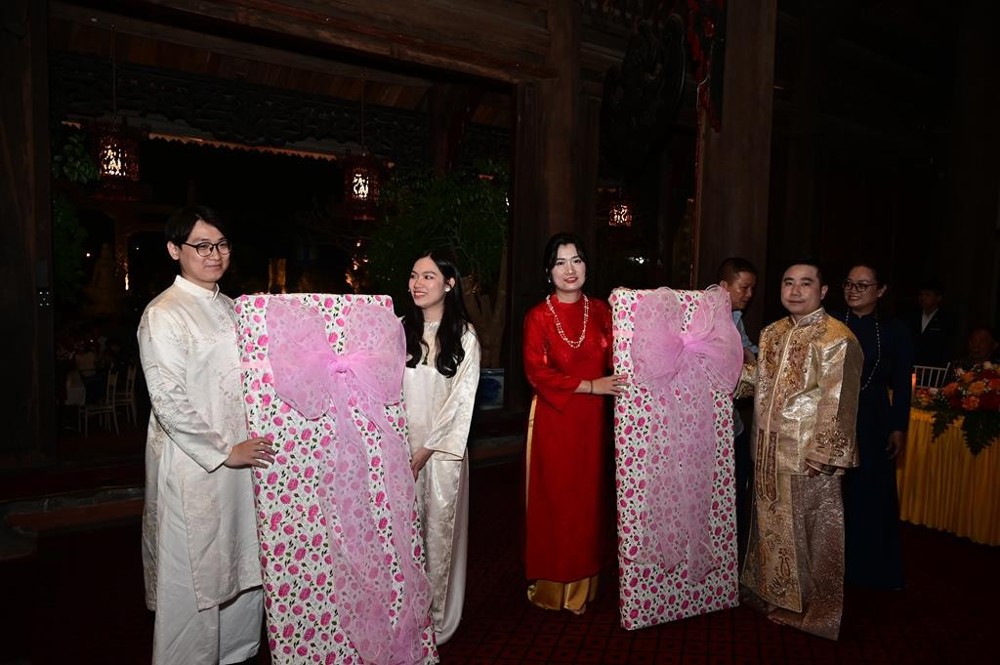 Trong niềm hoan hỷ của toàn thể đại chúng, Thượng tọa trụ trì cùng đại diện Phật tử và hai bên gia đình đã trao những phần quà chúc phúc đầy ý nghĩa, chúc cho hai đôi bạn trẻ: “Trăm năm tình viên mãn, bạc đầu nghĩa phu thê.”