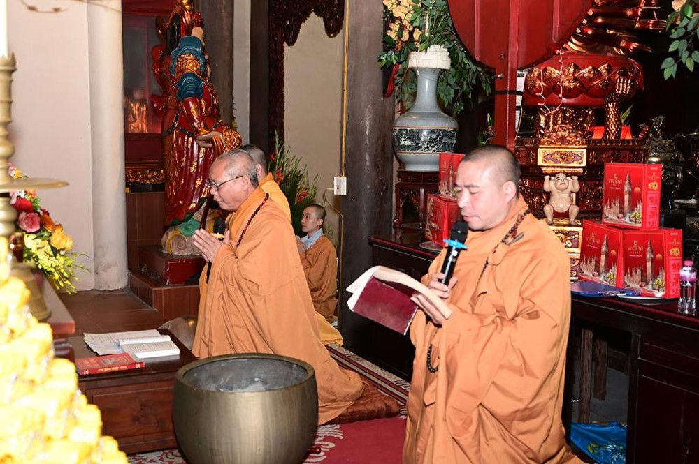 Tại chính điện, chư tôn đức Tăng Ni hiện tiền cùng hai đôi tân lang, tân nương và hai bên gia đình đã trang nghiêm tổ chức khóa lễ dâng hương, bạch Phật, lễ Phật cầu gia bị, tụng kinh cầu an, cầu nguyện cho buổi lễ Hằng thuận được thập phần viên mãn.