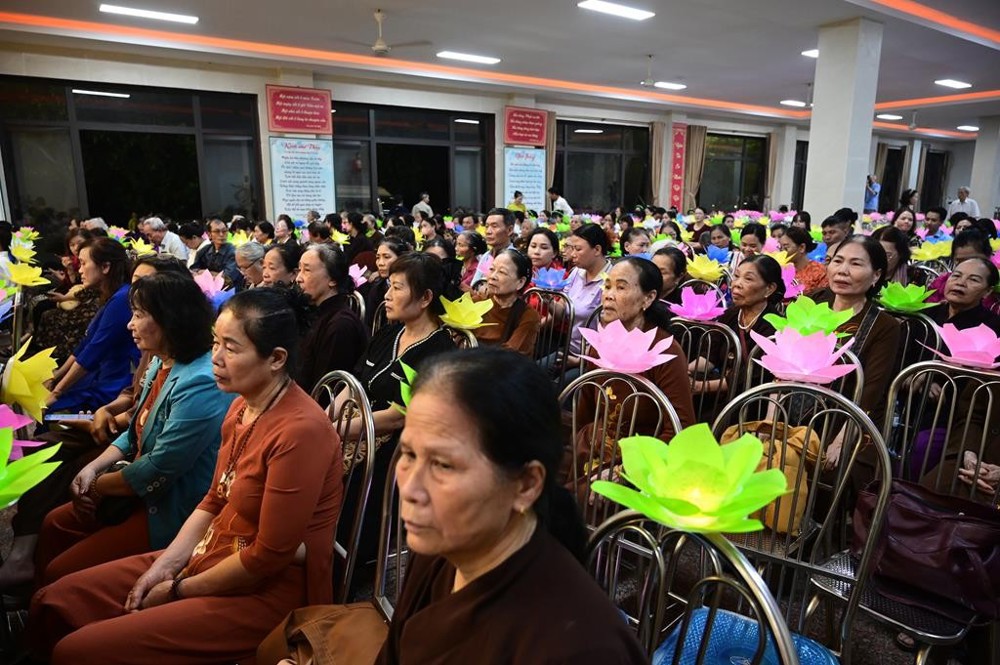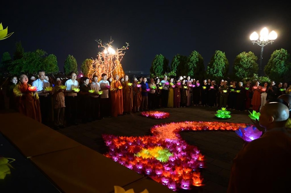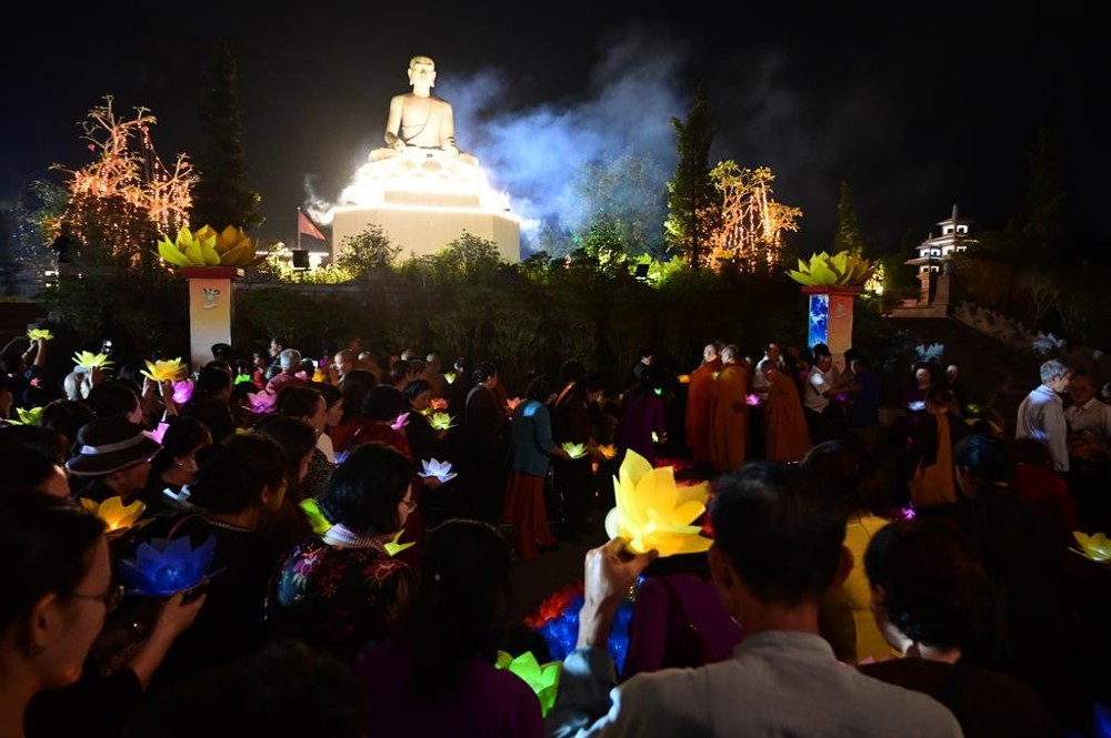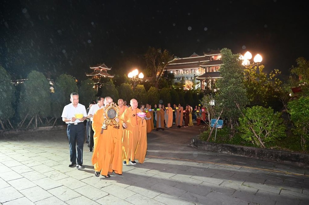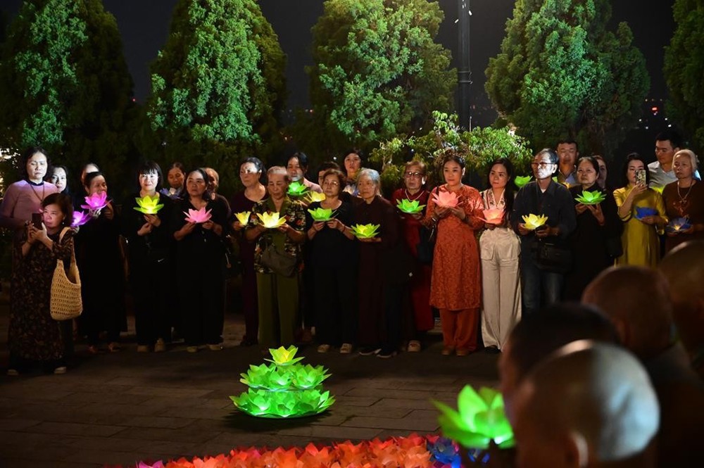 Tiếp đó, chư Tôn đức Tăng Ni và quý Phật tử cầm hoa đăng nhiễu Phật, niệm danh hiệu Đức Bản Sư Thích Ca Mâu Ni Phật và Bồ Tát Quán Thế Âm, dâng hoa đăng trước đại Phật tượng Trần Nhân Tông trong khuôn viên chùa Long Hoa, cầu nguyện và cúng dường ánh sáng lên Đức Phật và Bồ Tát.