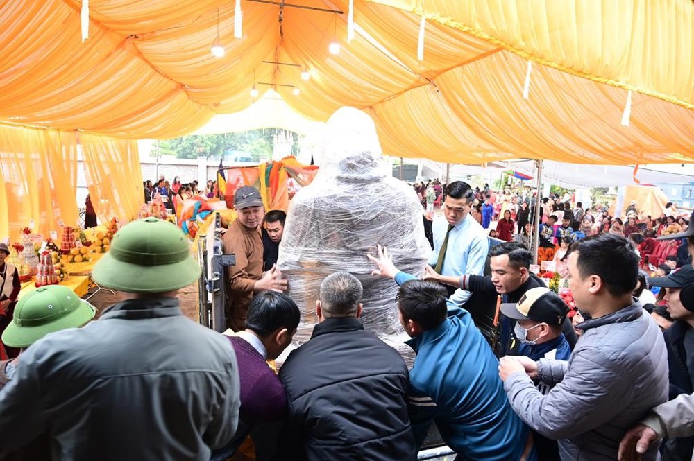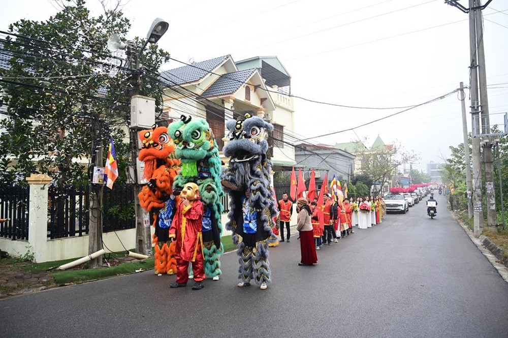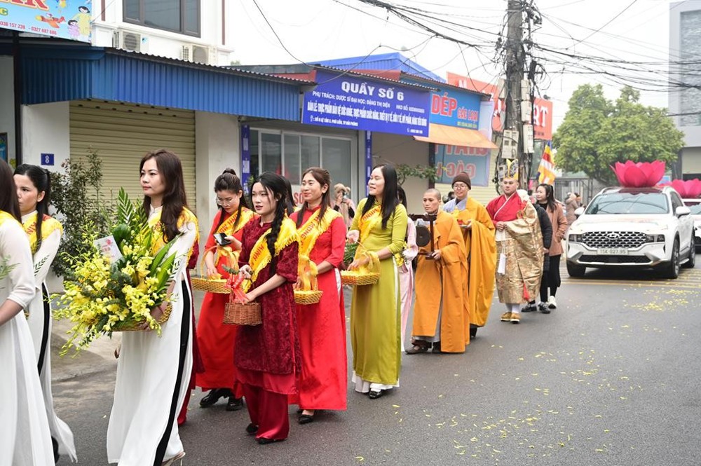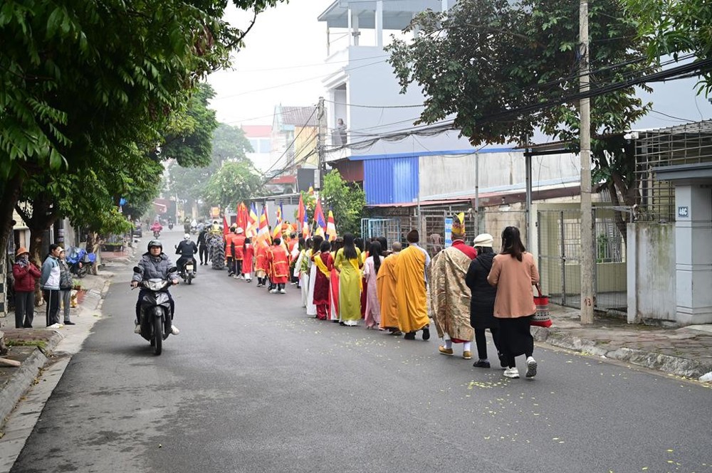 Ngay từ sáng sớm, mặc dù trời mưa và sương mù dày, Phật tử và nhân dân đã có mặt rất đúng giờ tại địa điểm chuẩn bị diễn ra lễ cung rước tôn tượng chư Bồ Tát, chư Tổ. Đúng 7 giờ 30 phút, đoàn rước bắt đầu khởi hành; trời tạnh mưa, sương mù tan dần. Đi đầu là đội lân – sư – rồng rực rỡ sắc màu; tiếp theo là các em nam thanh thiếu niên Phật tử cầm cờ Phật giáo; các em thanh thiếu niên Phật tử nữ cung nghinh chư Tôn đức Tăng Ni quang lâm chứng minh và tham dự buổi lễ. Sau đó là đoàn xe ô tô gồm 15 chiếc được trang trí đài sen hồng, cờ hoa, băng rôn, biểu ngữ ở đầu xe; tiếp đến là xe chở tôn tượng chư Bồ Tát, chư Tổ. Đi sau là đoàn Phật tử mang theo phẩm vật cúng dường với hơn 100 mâm lễ khác nhau, gồm lục cúng: hương, đăng, trà, quả, thực; sau cùng là đoàn tế nữ quan tay cầm cờ hoa, quạt trang hoàng rực rỡ, góp phần làm cho buổi lễ thêm phần trang nghiêm, thành kính.