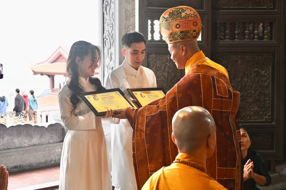 Dịp này, Hòa thượng Thích Thanh Giác – Trụ trì chùa Long Hoa, Trưởng BTC buổi lễ đã trao Giấy chứng nhận lễ Hằng Thuận và trao quà chúc phúc cho đôi bạn trẻ, cũng như những món quà Phật giáo ý nghĩa, chúc mừng đôi tân lang, tân nương kể từ nay đã nên vợ nên chồng và mong cho đôi bạn được “Trăm năm tình viên mãn, bạc đầu nghĩa phu thê”.