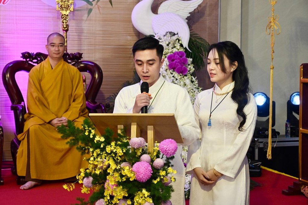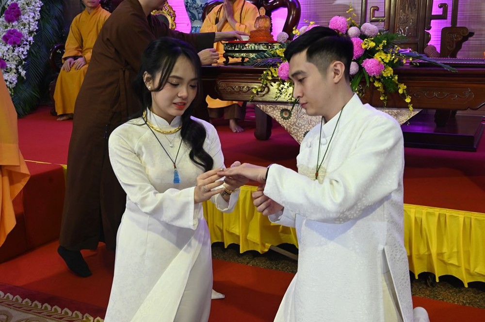 Trước sự chứng minh của chư Tôn đức Tăng Ni và sự chứng kiến của đại diện hai bên gia đình, đôi bạn trẻ đã trao nhẫn cưới cho nhau và dâng lời phát nguyện luôn yêu thương nhau, luôn tôn trọng nhau, luôn bảo vệ cho hạnh phúc của gia đình được trường tồn mãi mãi, nguyện sẽ hành trì theo đúng những điều Đức Phật đã chỉ dạy trong kinh Thiện Sinh, đồng thời sẽ cố gắng thực hành, giữ gìn 5 giới của người Phật tử tại gia, nguyện siêng năng, tinh tấn tu học để trở thành những người phật tử chân chính, hộ trì Tam Bảo.