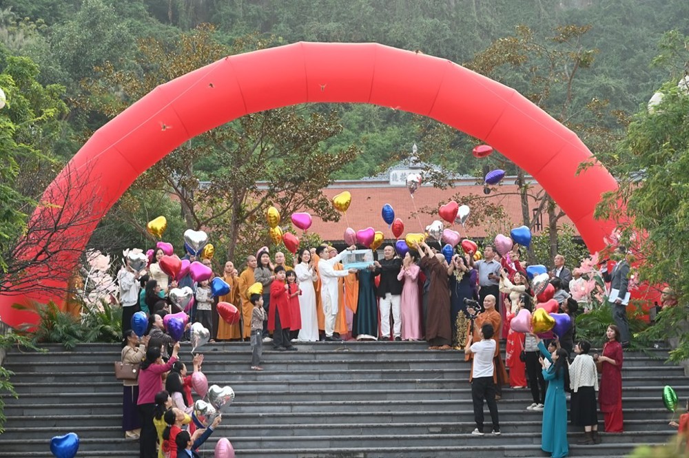 Trước khi kết thúc buổi lễ, chư Tôn đức Tăng Ni, cùng đôi tân lang, tân nương và đại diện hai bên gia đình đã tổ chức lễ phóng sinh, thả bóng bay cầu nguyện thế giới hòa bình, chúng sinh an lạc, nhân khang, vật thịnh và dùng tiệc chay tại chùa trong không khí hoan hỷ, ấm áp.
