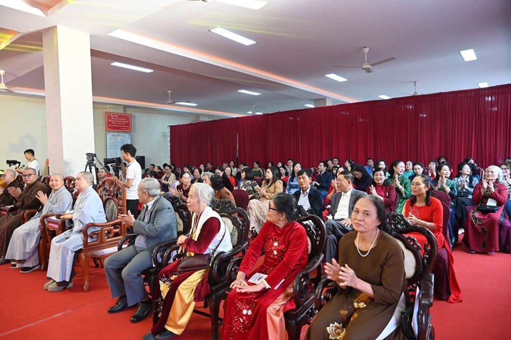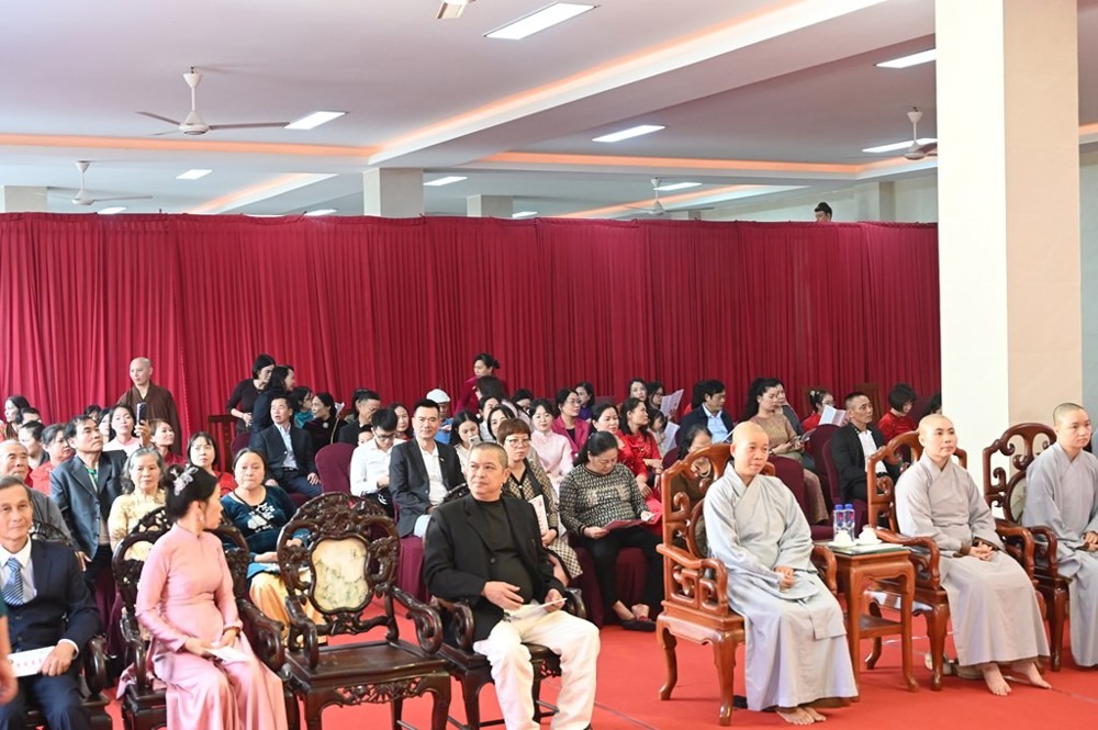Tại buổi lễ, đôi tân lang, tân nương và toàn thể đại chúng đã được Hòa thượng Thích Thanh Giác bố thí cho một thời pháp chia sẻ về đạo nghĩa vợ chồng đã được Đức Phật thuyết trong kinh điển. Theo đó, trong kinh Thiện Sinh, Đức Phật đã chỉ dạy rất rõ về bổn phận của của người vợ đối với người chồng và gia đình bên chồng, cũng như bổn phận của người chồng đối với vợ và gia đình bên vợ; bổn phận của cha mẹ đối với con cái và bổn phận của con cái đối với cha mẹ…Ngoài ra, Hòa thượng cũng giảng giải cho hai bạn hiểu về ý nghĩa của chiếc nhẫn cũng như ý nghĩa của chữ “Nhẫn” đối với hạnh phúc gia đình. Nhẫn ở đây là sự nhẫn nhịn, vợ chồng phải biết nhường nhịn, nhẫn nhịn nhau, tôn trọng nhau; “Nhẫn” ở đây chính là sự tu dưỡng đạo đức và tu dưỡng phẩm hạnh. Một gia đình có được êm ấm, có được hòa thuận, hạnh phúc hay không, phần lớn là do sự nhẫn nhịn quyết định.