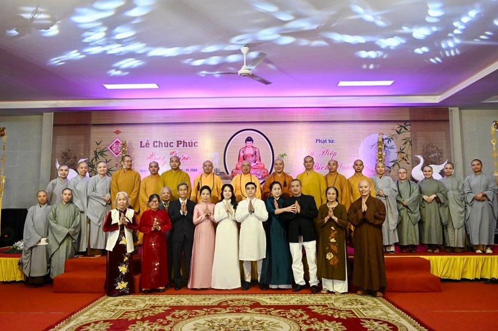 Trong không khí hoan hỷ của buổi lễ, toàn thể đại chúng đã tụng kinh Thiện Sinh cầu nguyện, chúc phúc cho đôi bạn trẻ, cầu nguyện chư Phật, chư Bồ tát, chư hộ pháp thiện thần chứng minh, gia hộ cho đôi tân lang, tân nương được cát tường, thường lạc, luôn hạnh phúc, bình an trong ánh sáng và tình thương của mười phương chư Phật.
