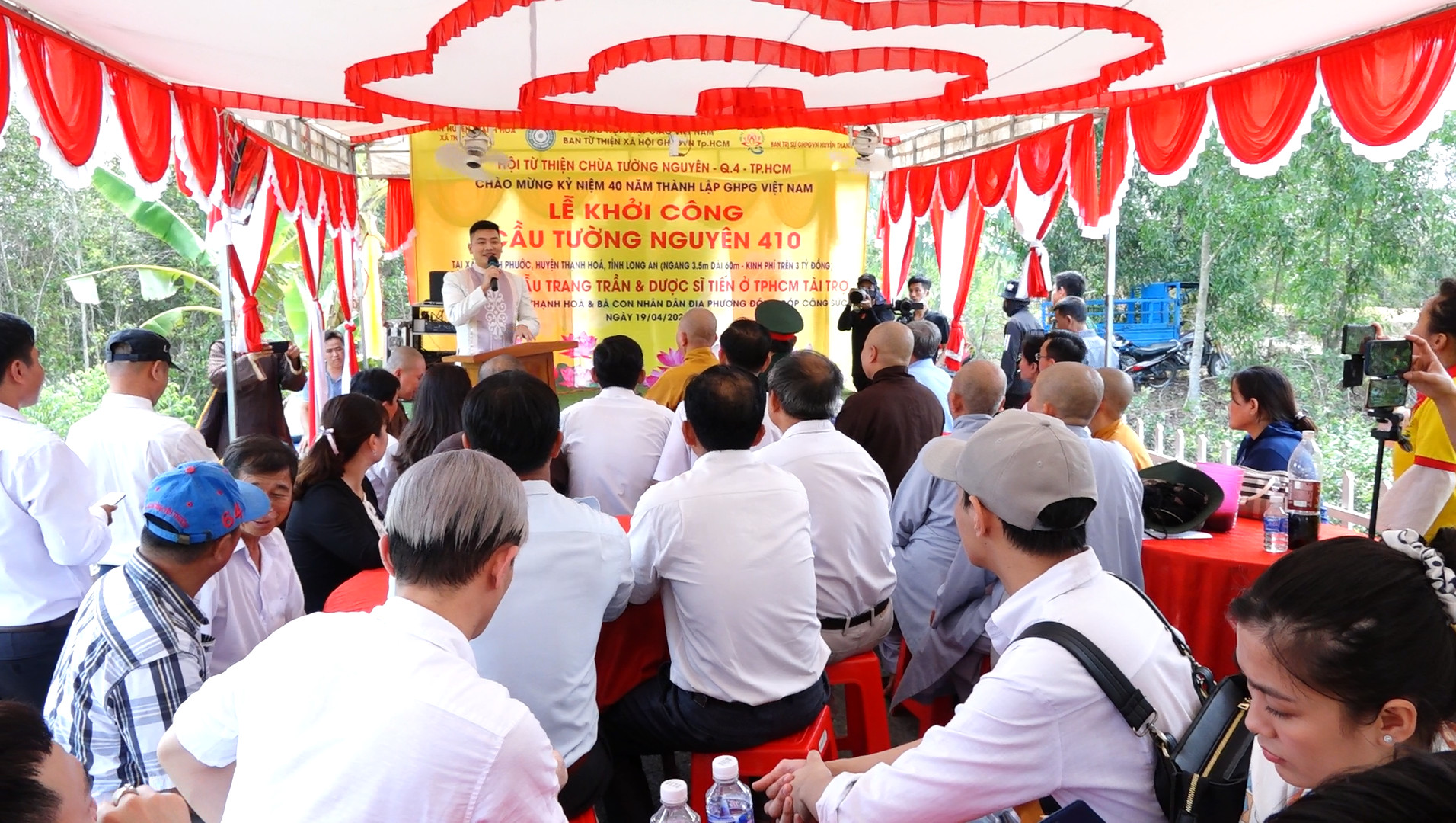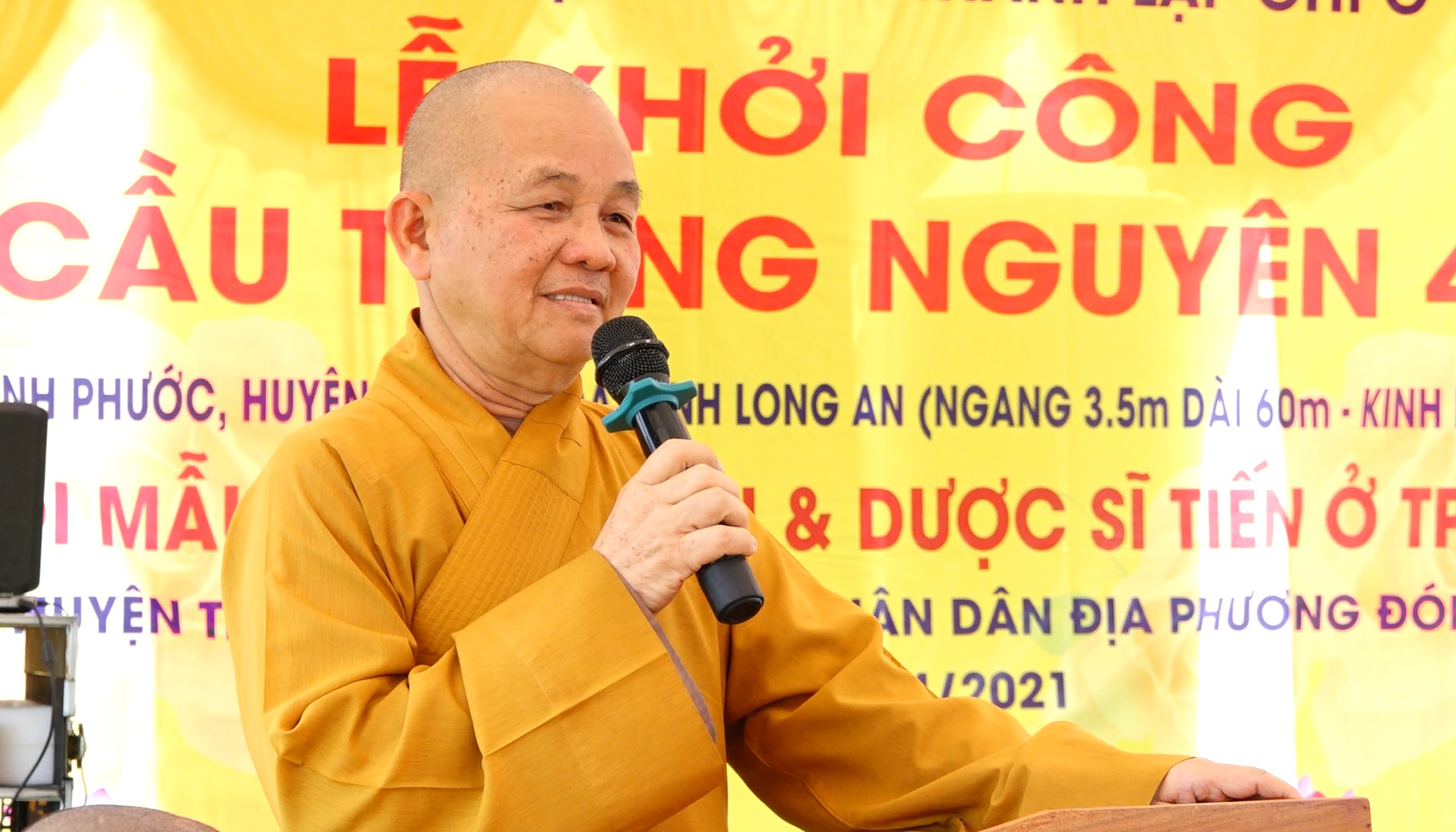 Tiếp đó, HT. Thích Minh Thiện phát biểu cảm ơn ĐĐ. Thích Minh Phú và Hội từ thiện Tường Nguyên đã phát tâm tài trợ, góp sức, giúp cho bà con vùng quê sông nước Long An xây dựng nhiều cây cầu giao thông, giúp việc đi lại, giao thương hàng hóa được thuận tiện, góp phần phát triển kinh tế nông thôn. Hòa thượng cũng bày tỏ mong muốn chính quyền địa phương và bà con sẽ hỗ trợ và tạo điều kiện thuận lợi cho công trình xây dựng cầu Tường Nguyên số 410 nhanh chóng được thành tựu.