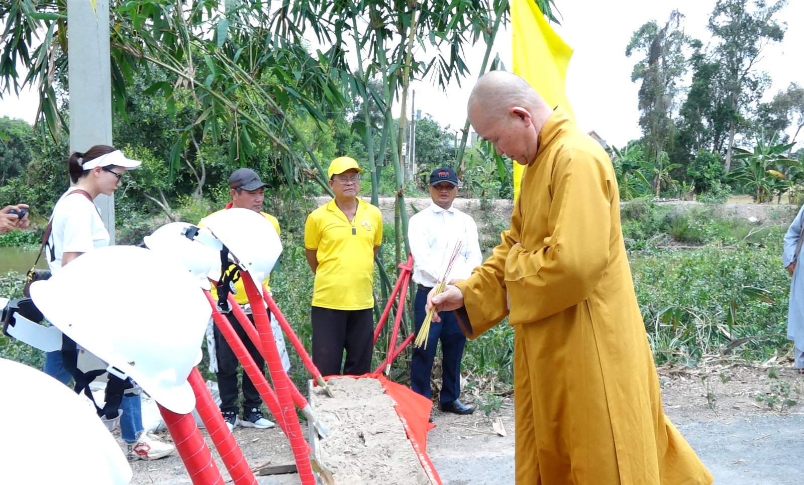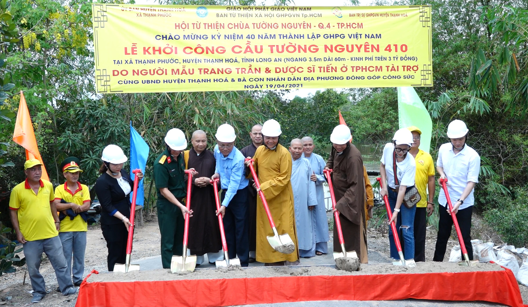 Cuối buổi lễ, chư tôn đức, quý mạnh thường quân, nhà tài trợ và Phật tử đã thực hiện nghi thức động thổ xây cầu, nhất tâm cầu nguyện cho công trình xây dựng sớm được hoàn thành.