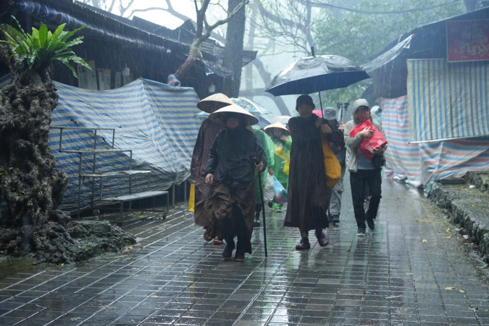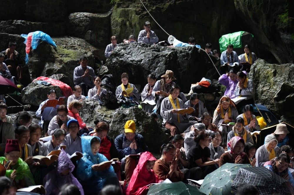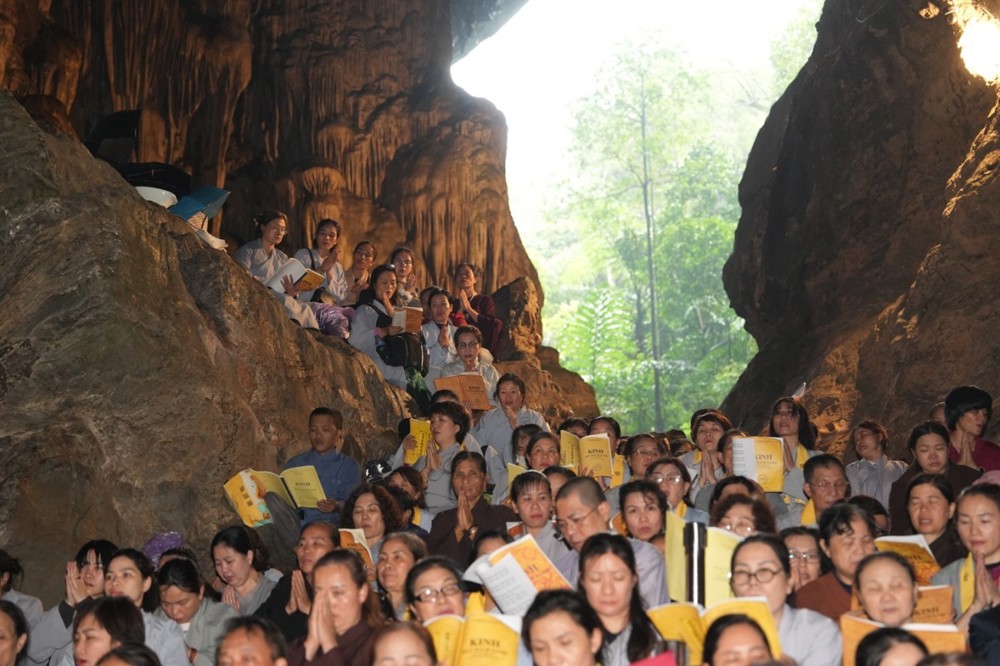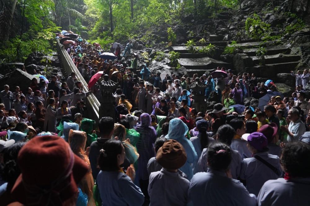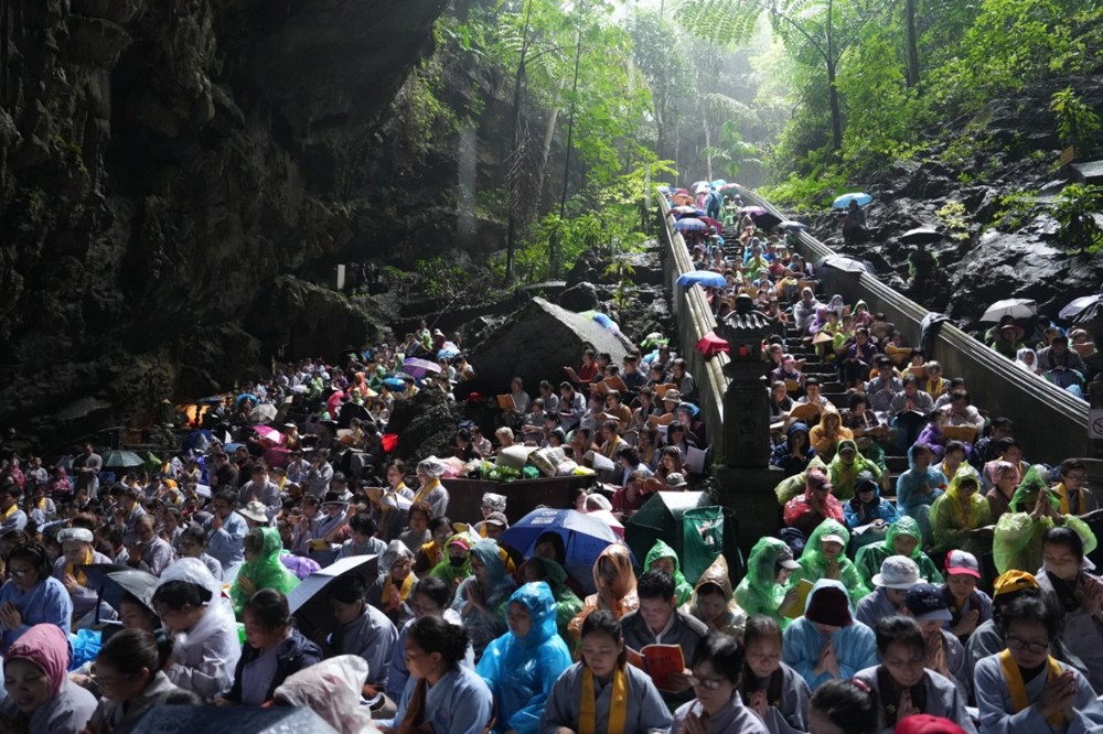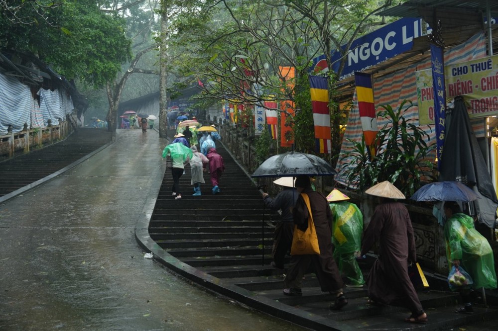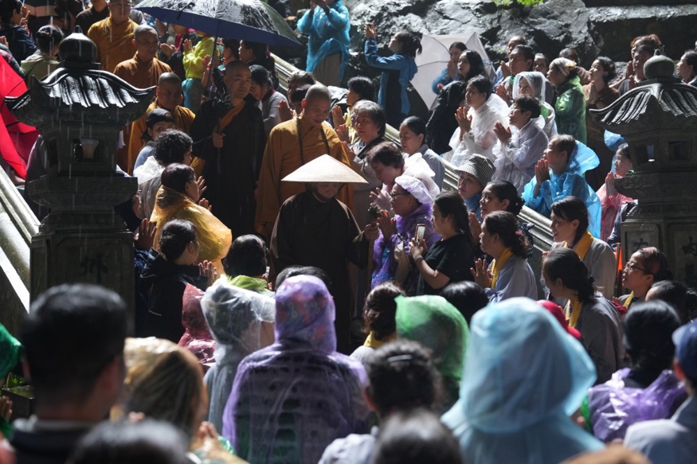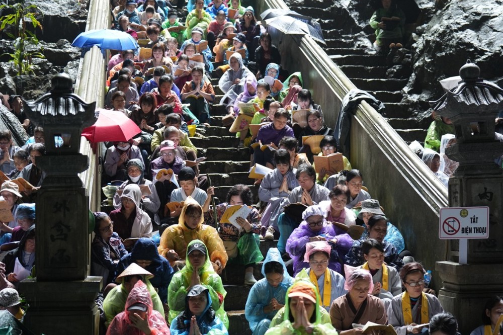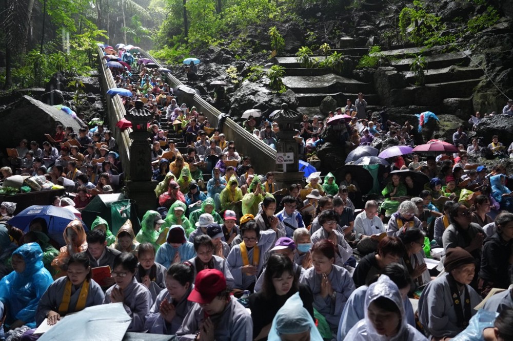 Người choàng áo mưa, người che ô, áo lam thấm nước lạnh, nhưng ánh mắt và tâm hồn ai nấy vẫn đều hướng trọn về tôn tượng Bồ Tát Quán Thế Âm. Từng tiếng niệm hồng danh vang lên trầm hùng giữa mưa gió, ngân dài trong động thiêng, như kết nối từng nhịp thở với tâm nguyện quay về nương tựa nơi Bồ Tát – bậc Mẹ hiền Từ Bi. Trong khoảnh khắc ấy, giữa bão giông của đất trời, vẫn tồn tại sự tĩnh lặng trong nội tâm mỗi người; và chính nơi đó, niềm tin, sự thành kính và hạnh nguyện của người con Phật được dâng lên một cách sâu sắc nhất.