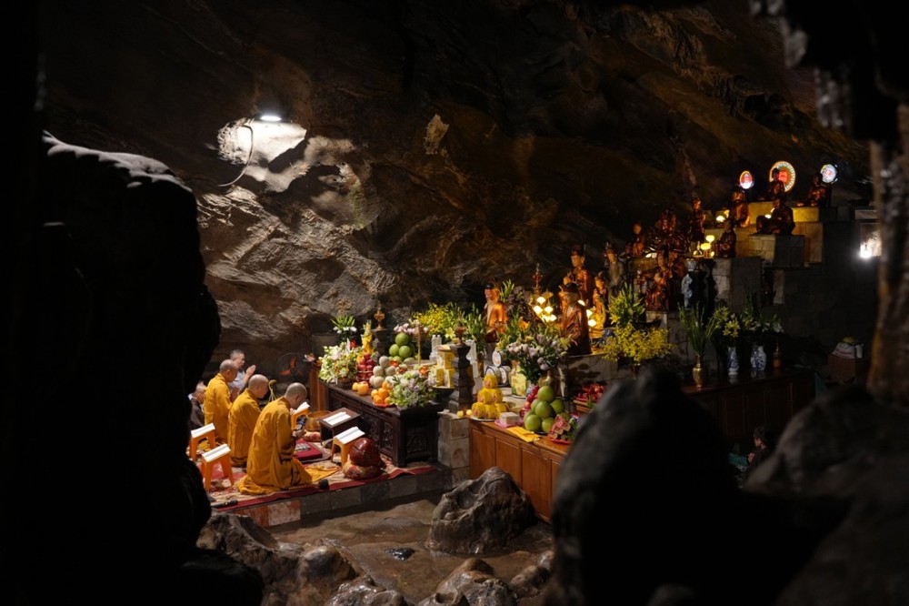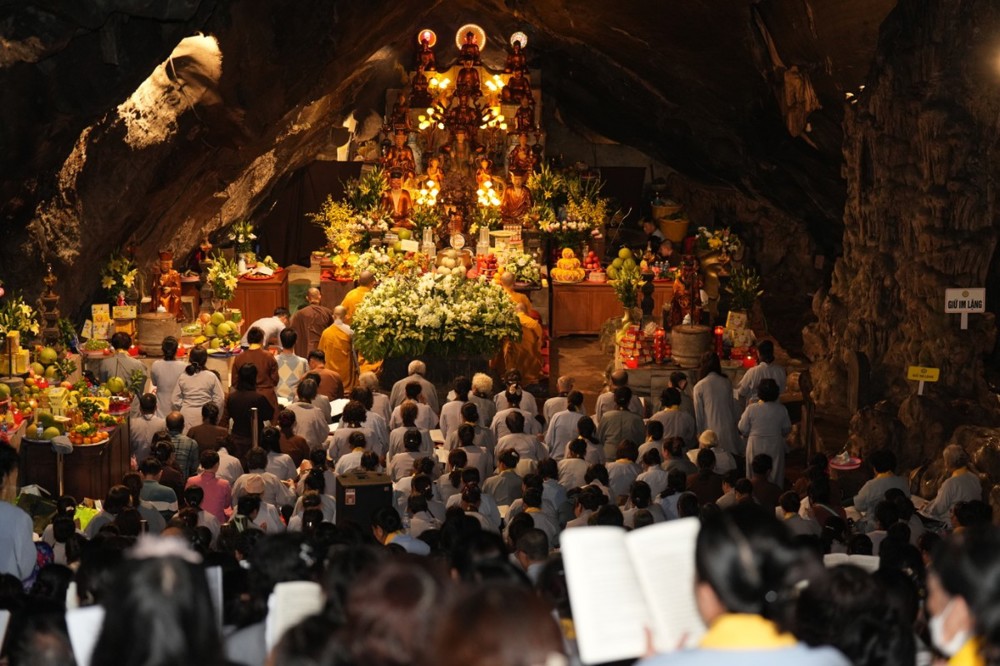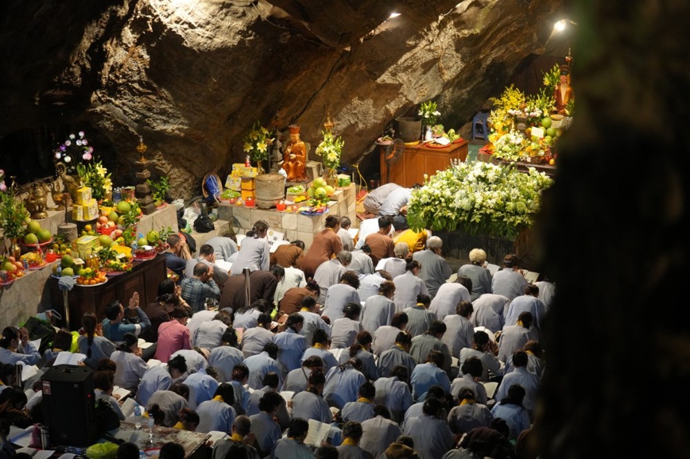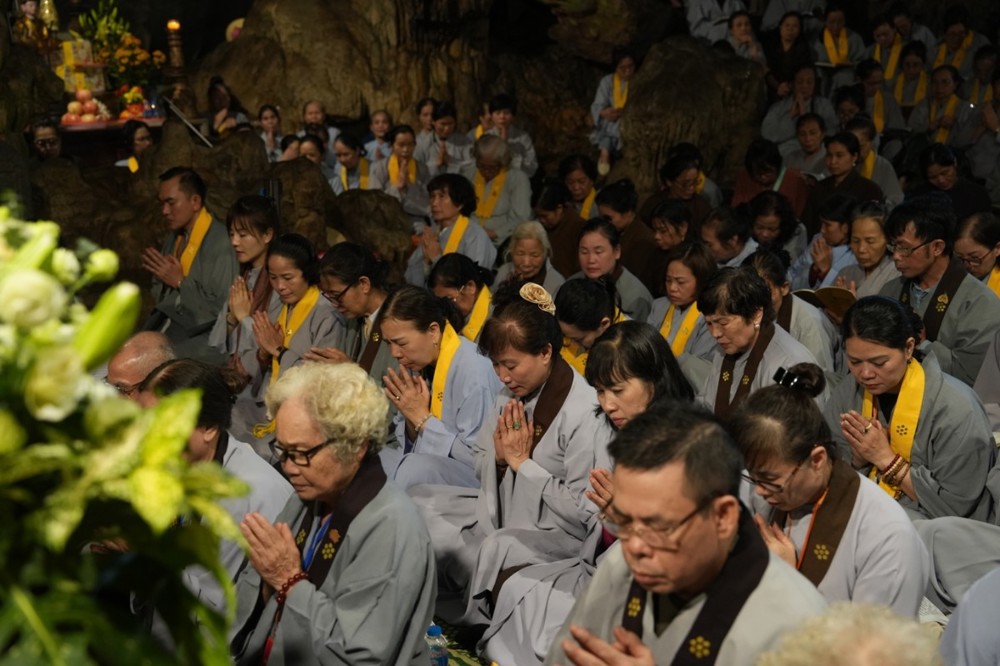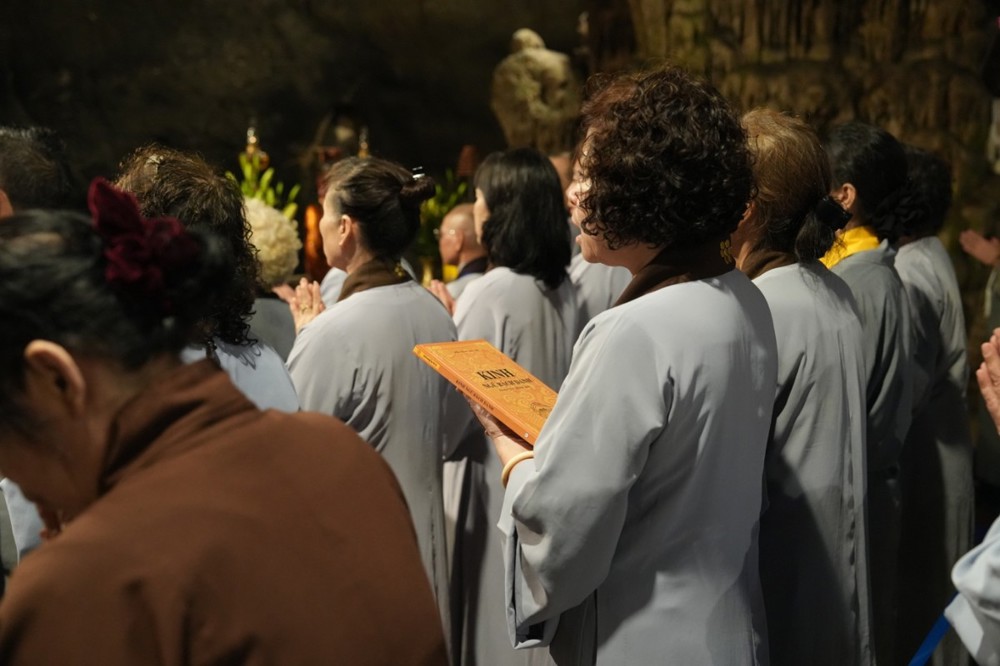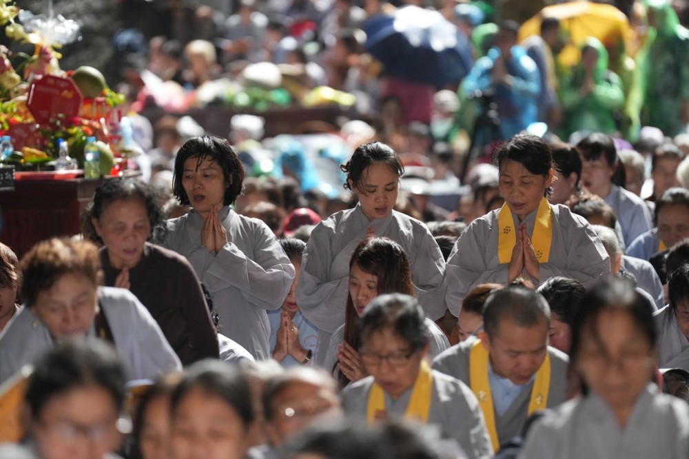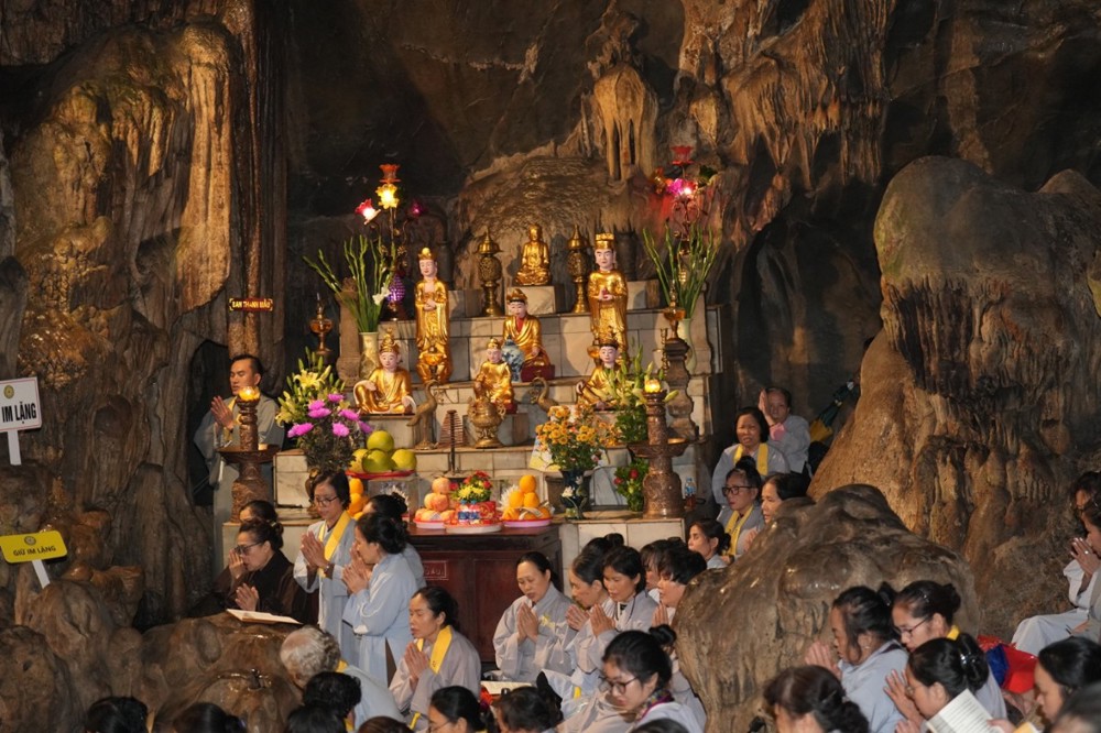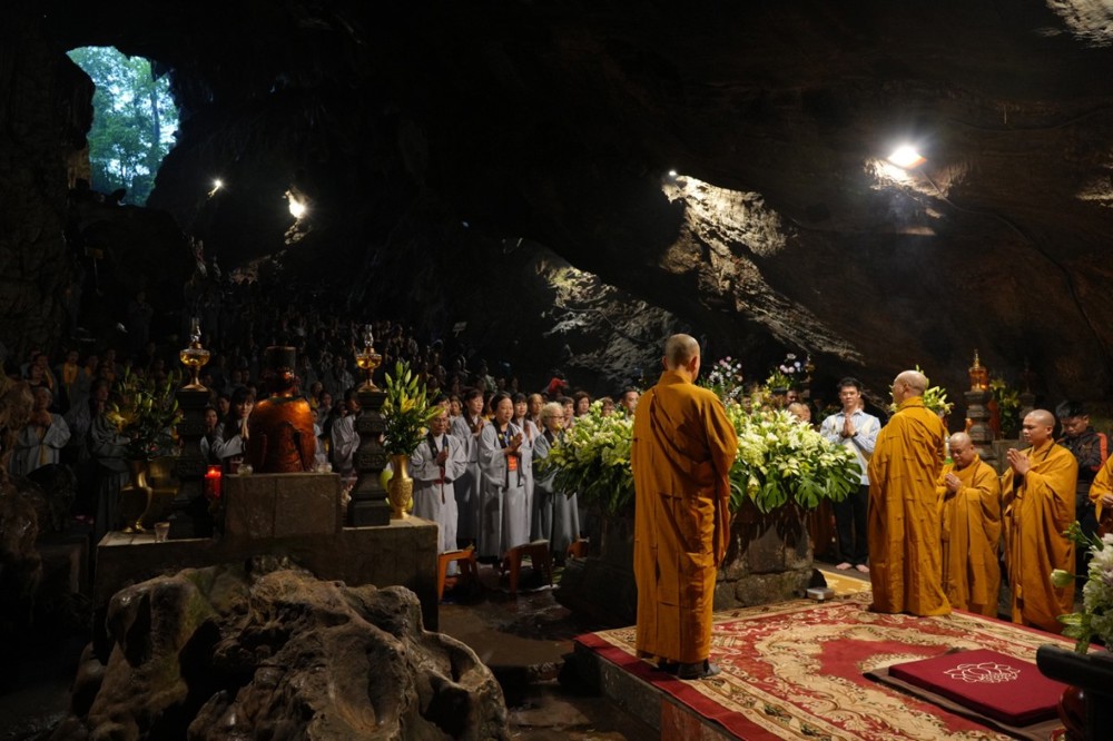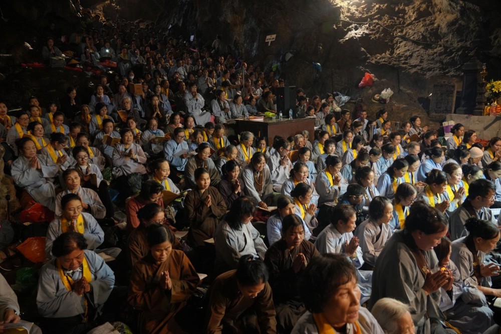 Người choàng áo mưa, người che ô, áo lam thấm nước lạnh, nhưng ánh mắt và tâm hồn ai nấy vẫn đều hướng trọn về tôn tượng Bồ Tát Quán Thế Âm. Từng tiếng niệm hồng danh vang lên trầm hùng giữa mưa gió, ngân dài trong động thiêng, như kết nối từng nhịp thở với tâm nguyện quay về nương tựa nơi Bồ Tát – bậc Mẹ hiền Từ Bi. Trong khoảnh khắc ấy, giữa bão giông của đất trời, vẫn tồn tại sự tĩnh lặng trong nội tâm mỗi người; và chính nơi đó, niềm tin, sự thành kính và hạnh nguyện của người con Phật được dâng lên một cách sâu sắc nhất.