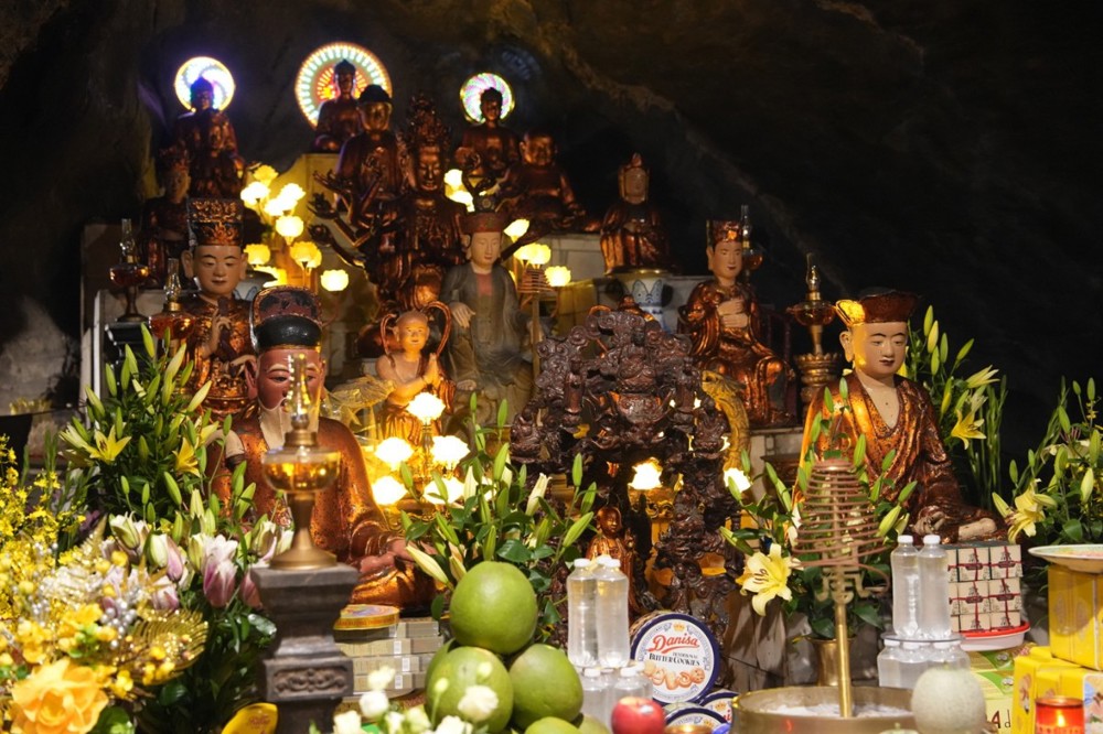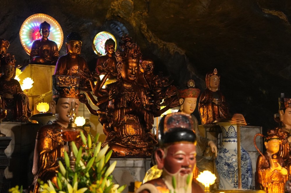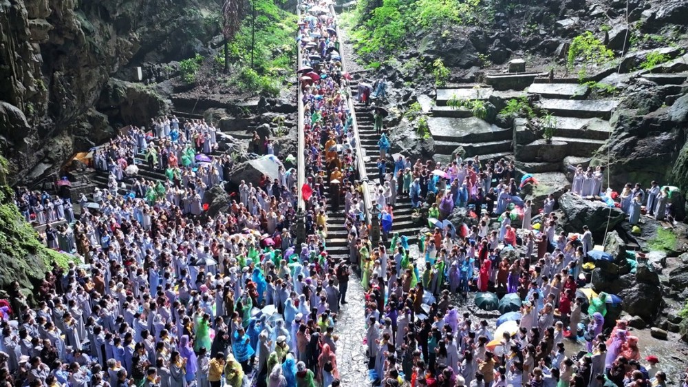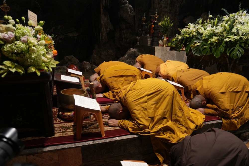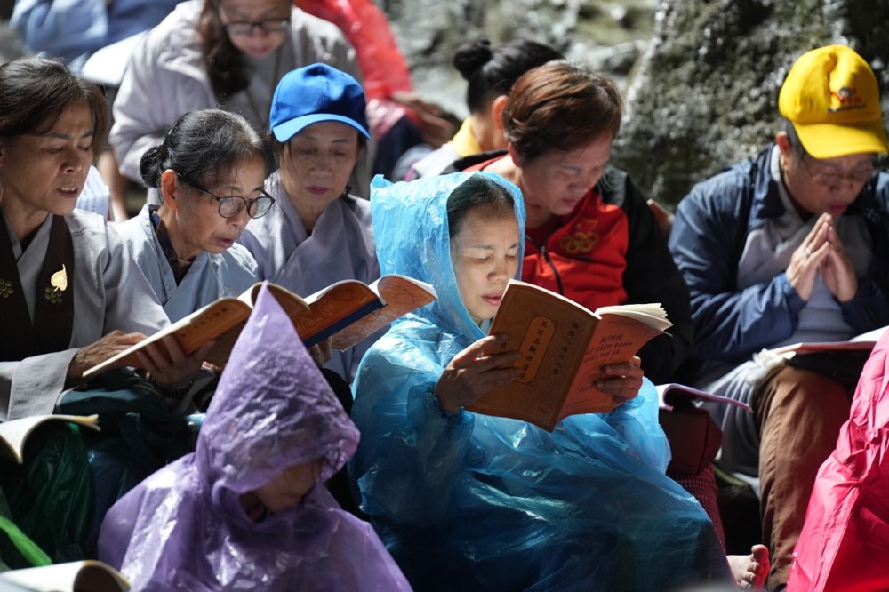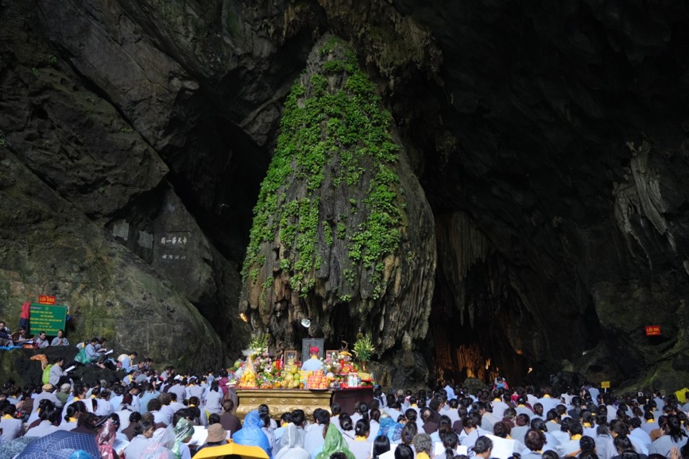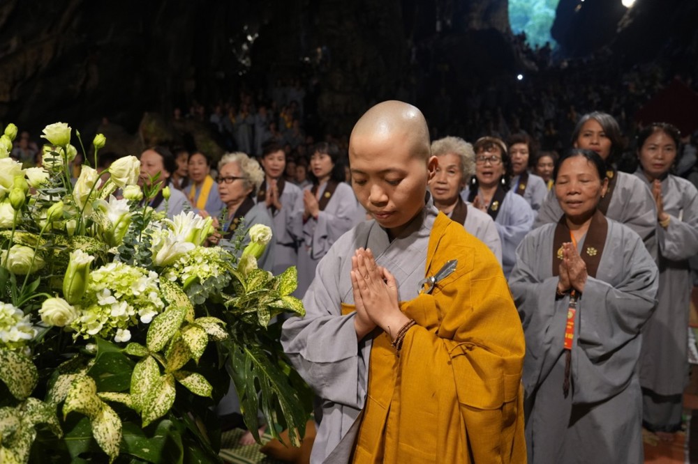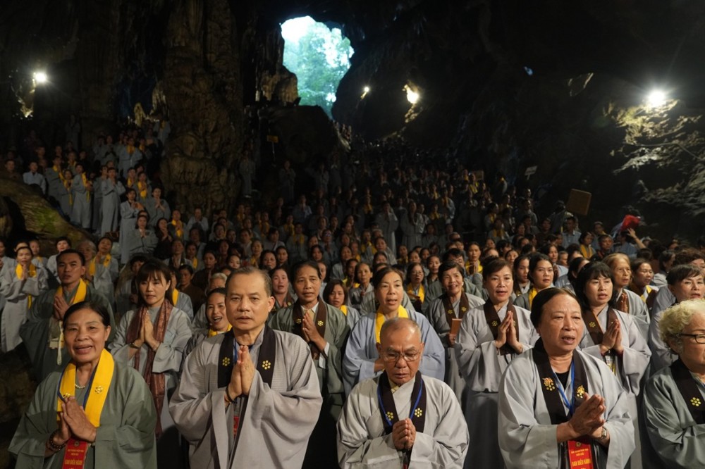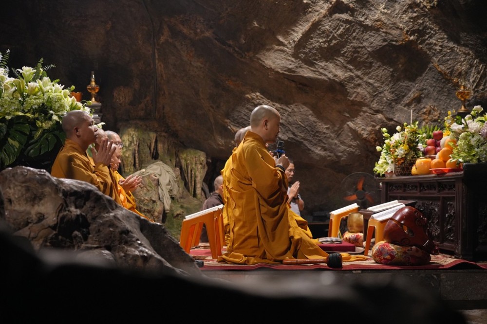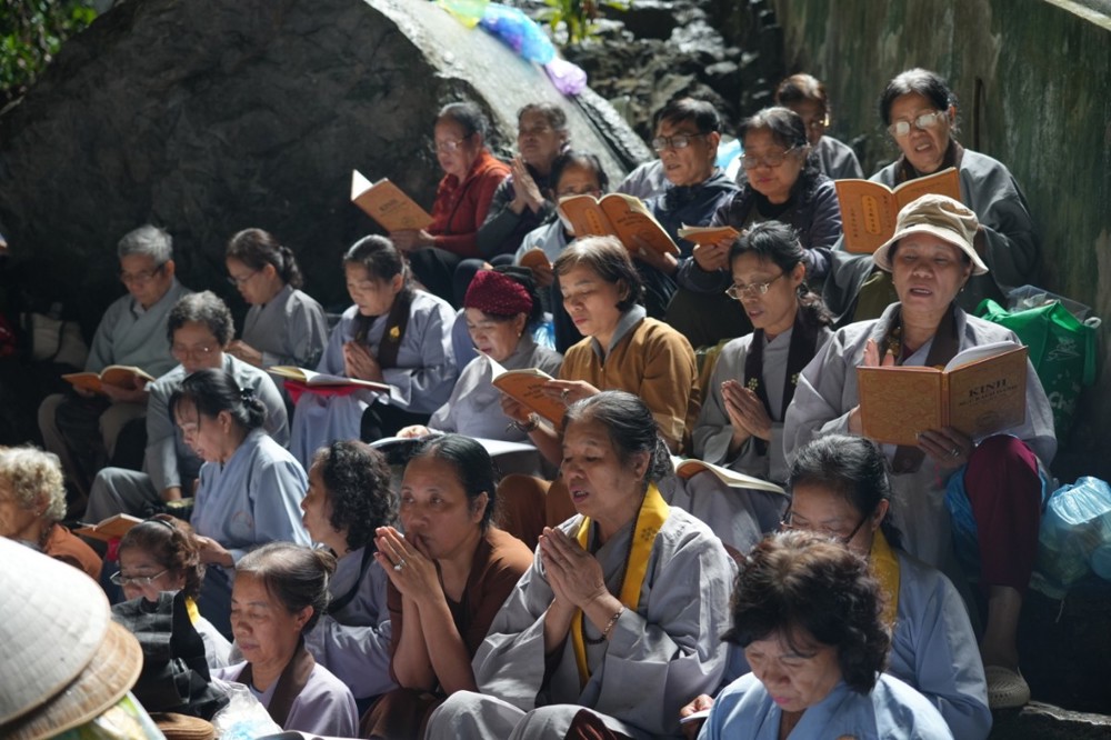 Người choàng áo mưa, người che ô, áo lam thấm nước lạnh, nhưng ánh mắt và tâm hồn ai nấy vẫn đều hướng trọn về tôn tượng Bồ Tát Quán Thế Âm. Từng tiếng niệm hồng danh vang lên trầm hùng giữa mưa gió, ngân dài trong động thiêng, như kết nối từng nhịp thở với tâm nguyện quay về nương tựa nơi Bồ Tát – bậc Mẹ hiền Từ Bi. Trong khoảnh khắc ấy, giữa bão giông của đất trời, vẫn tồn tại sự tĩnh lặng trong nội tâm mỗi người; và chính nơi đó, niềm tin, sự thành kính và hạnh nguyện của người con Phật được dâng lên một cách sâu sắc nhất.