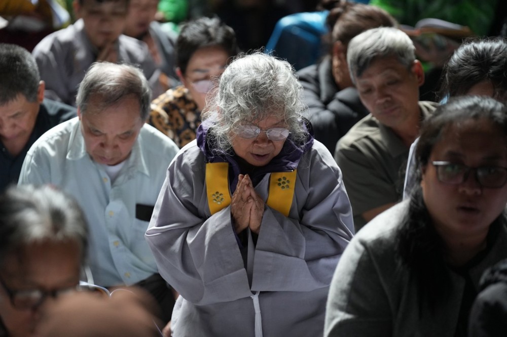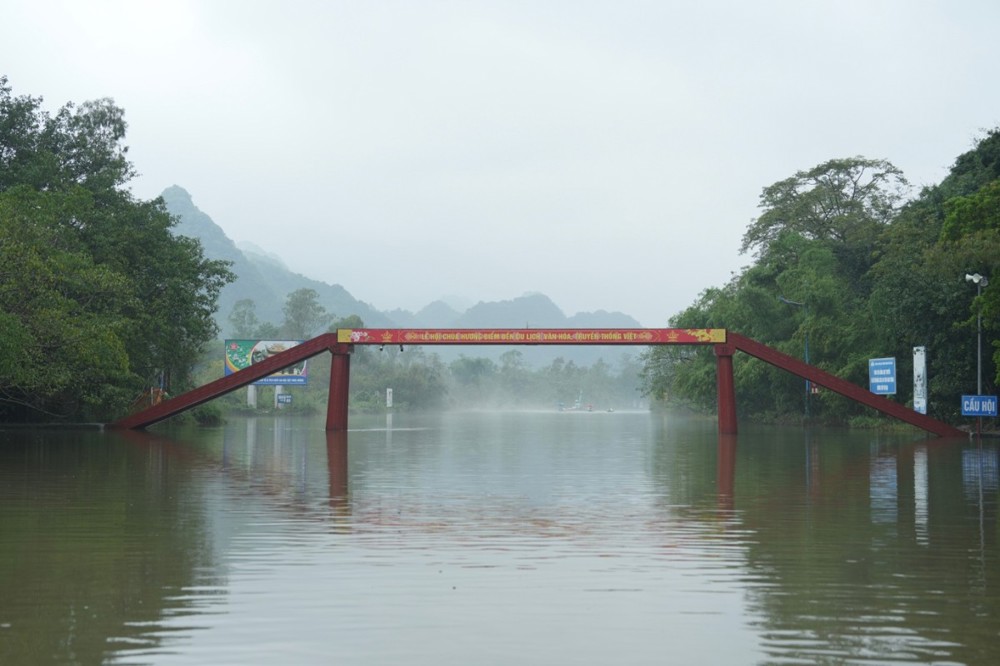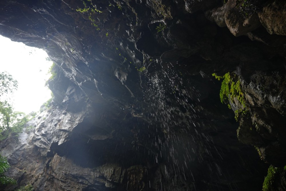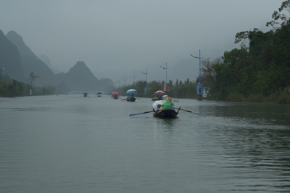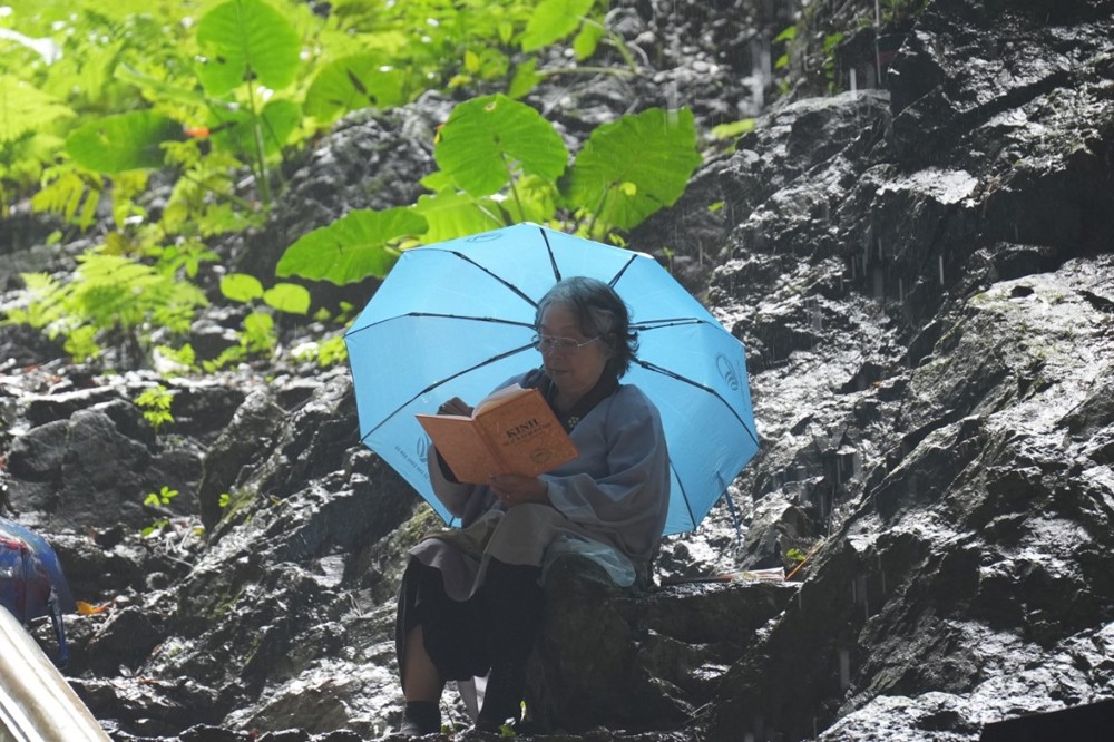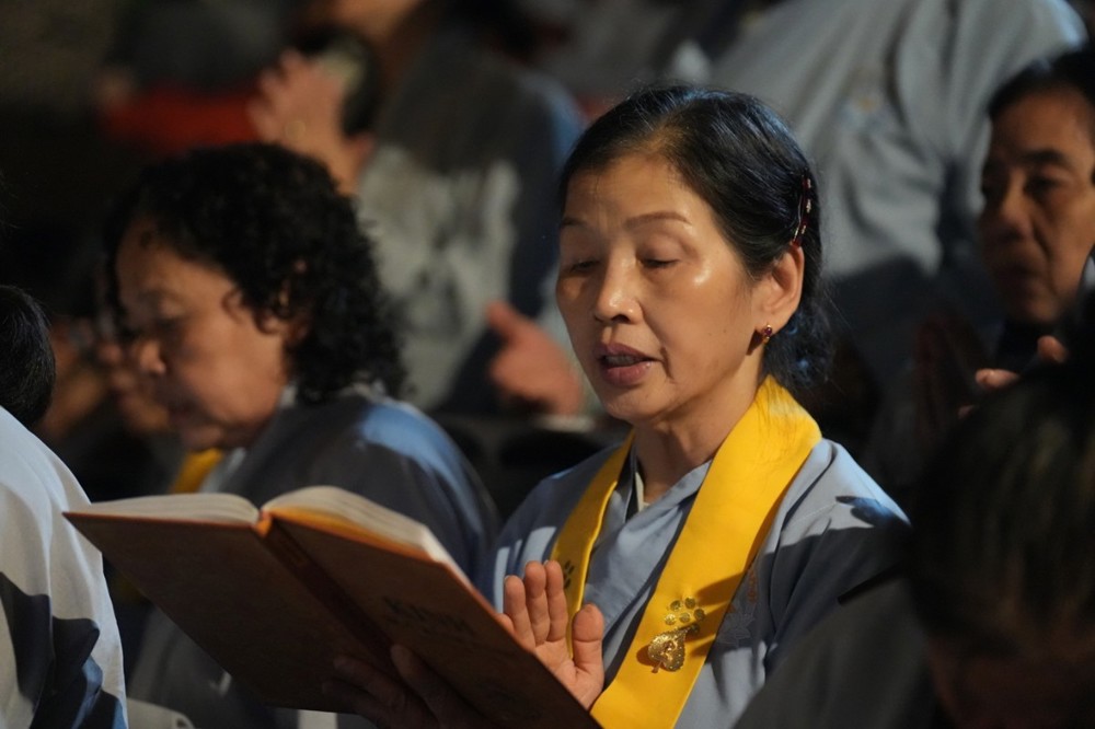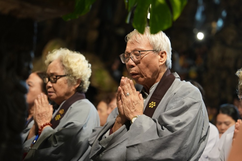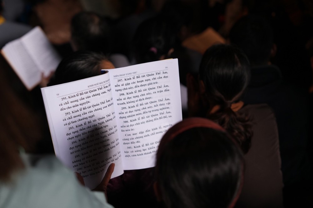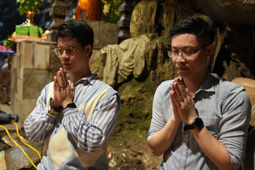 Người choàng áo mưa, người che ô, áo lam thấm nước lạnh, nhưng ánh mắt và tâm hồn ai nấy vẫn đều hướng trọn về tôn tượng Bồ Tát Quán Thế Âm. Từng tiếng niệm hồng danh vang lên trầm hùng giữa mưa gió, ngân dài trong động thiêng, như kết nối từng nhịp thở với tâm nguyện quay về nương tựa nơi Bồ Tát – bậc Mẹ hiền Từ Bi. Trong khoảnh khắc ấy, giữa bão giông của đất trời, vẫn tồn tại sự tĩnh lặng trong nội tâm mỗi người; và chính nơi đó, niềm tin, sự thành kính và hạnh nguyện của người con Phật được dâng lên một cách sâu sắc nhất.