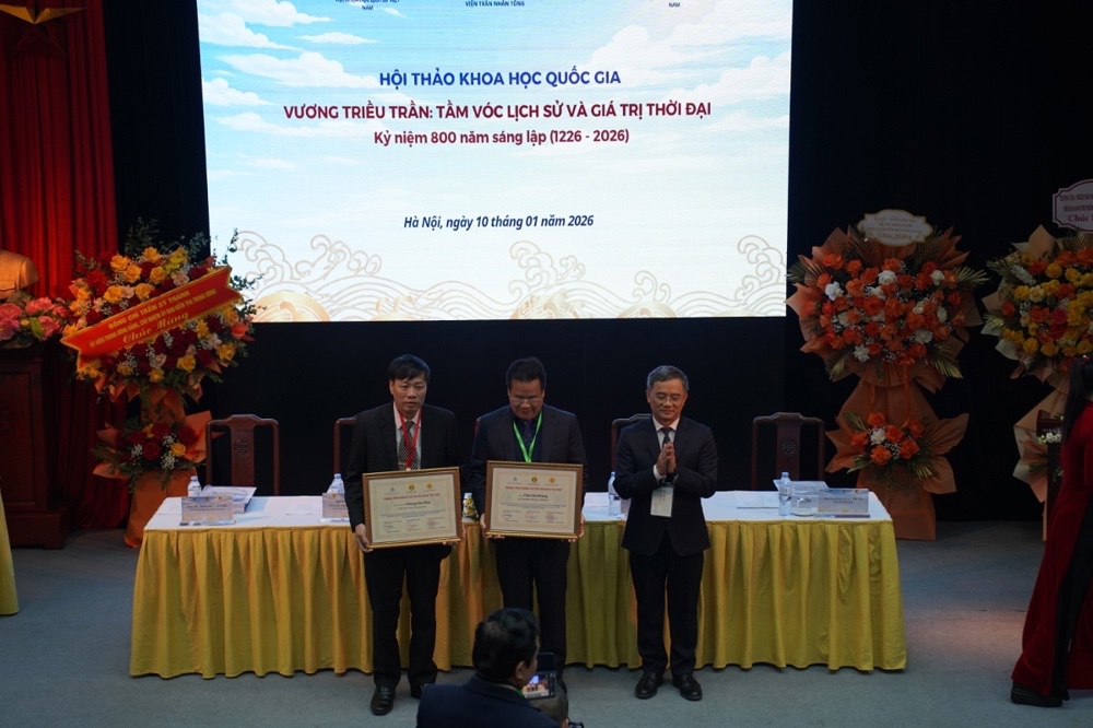 Nhân dịp này, GS.TSKH. Vũ Minh Giang, Phó Chủ tịch Hội Khoa học Lịch sử Việt Nam; PGS.TS. Nguyễn Tiến Vinh, Viện trưởng Viện Trần Nhân Tông; Trung tướng, PGS.TS. Trần Đình Nhã, Chủ tịch Hội đồng họ Trần Việt Nam tặng chứng nhận và tặng hoa vinh danh đối với 2 doanh nhân - nhà tài trợ cho hội thảo.