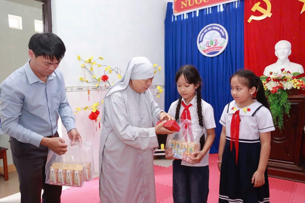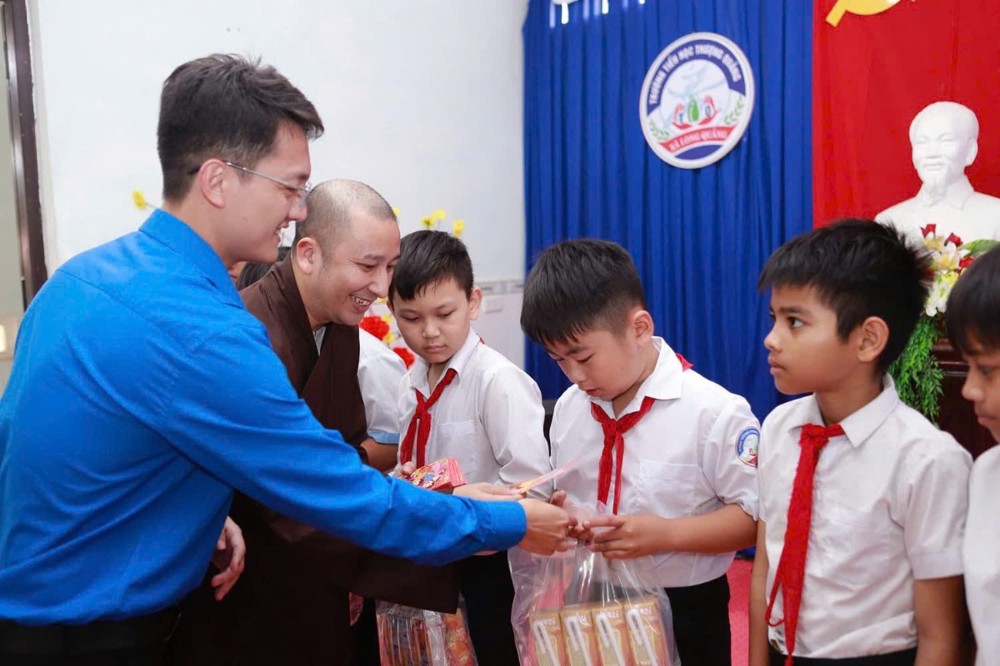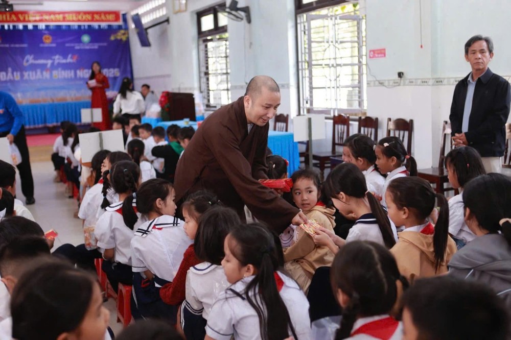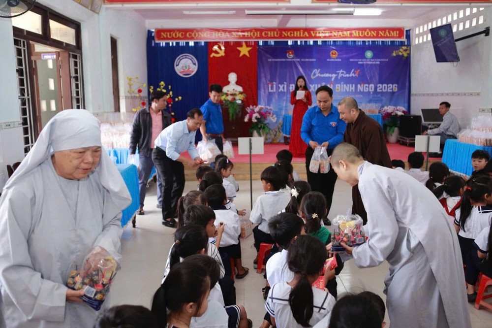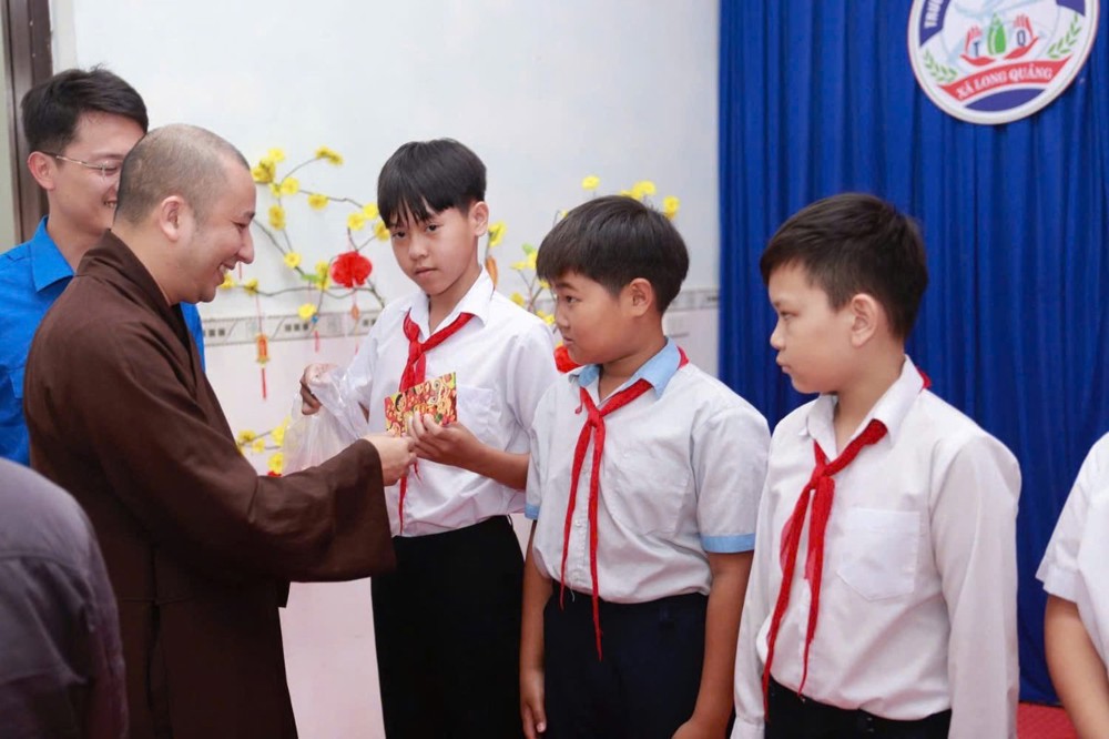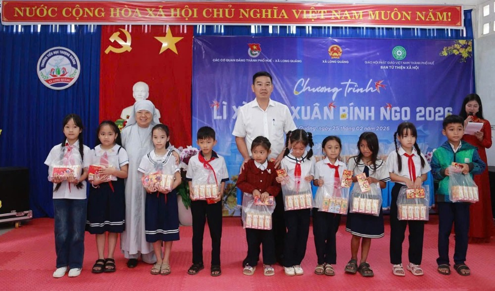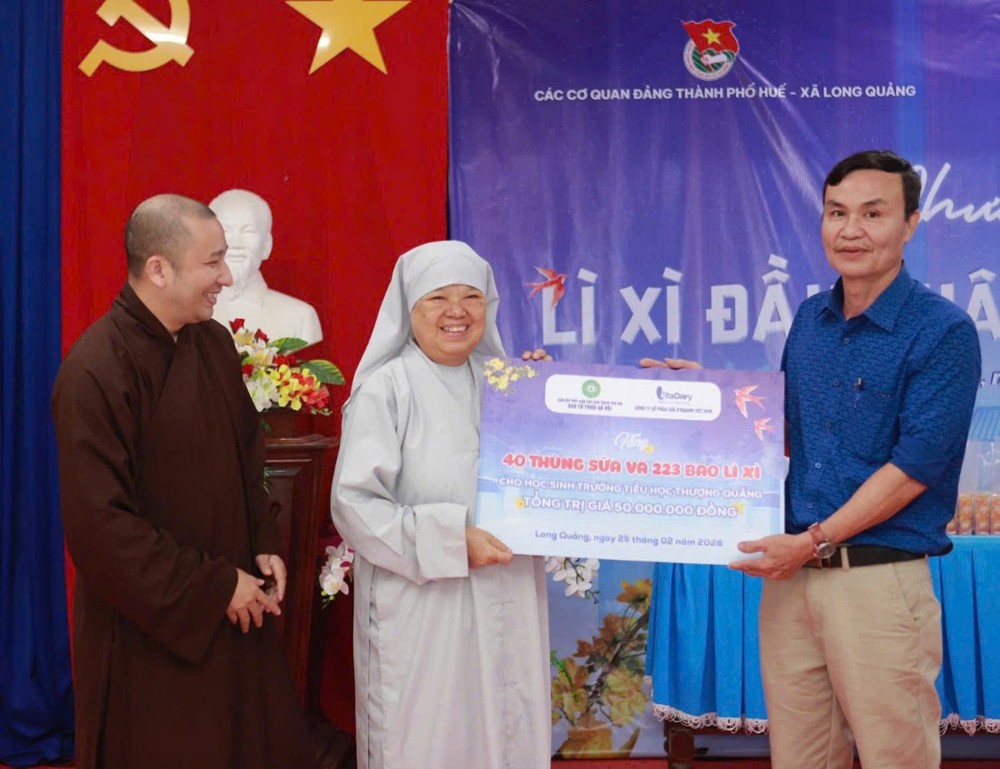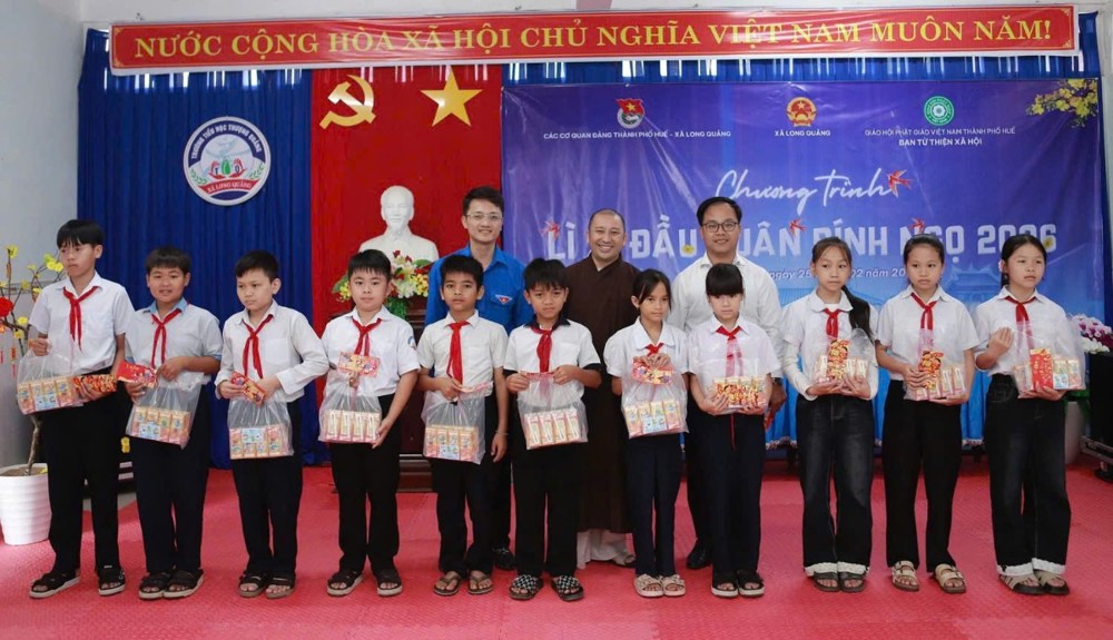 Trong không khí ấm áp của những ngày đầu xuân Bính Ngọ 2026, sáng ngày 25/02/2026 (nhằm ngày 09 tháng Giêng ÂL), Ban Từ thiện Xã hội GHPGVN thành phố Huế đã phối hợp cùng UBND xã Long Quảng, các ban ngành đoàn thể địa phương, Đoàn Thanh niên xã Long Quảng và Công ty Cổ phần Sữa Vitadairy Việt Nam tổ chức chương trình trao quà và lì xì đầu xuân đến 223 em học sinh Trường Tiểu học Thượng Quảng.