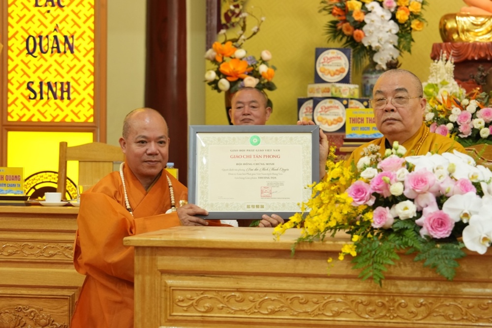 Thay mặt Trung ương Giáo hội, Trưởng lão Hòa thượng Thích Thanh Nhiễu đã trao Giáo chỉ tấn phong hàng Thượng tọa; Hòa thượng Thích Thanh Hiện trao giáo chỉ tấn phong hàng Ni sư.