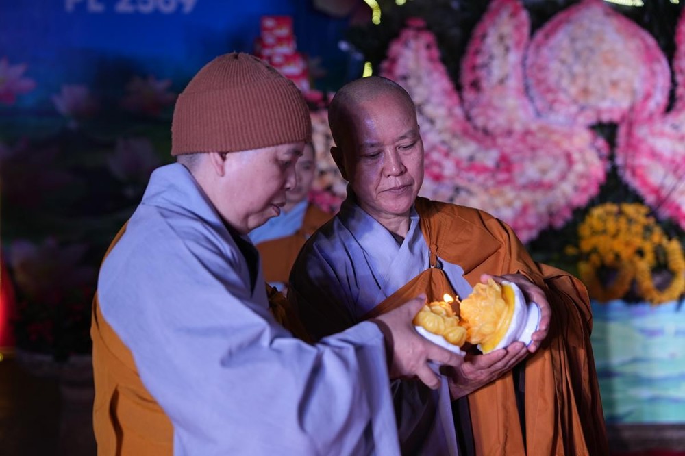 Tiếp theo chương trình là nghi thức dâng hương của chư tôn đức chứng minh. Và giây phút thiêng liêng nhất của buổi lễ được hàng Phật tử mong chờ nhất, chính là nghi thức truyền đăng. Hòa thượng Thích Bảo Nghiêm đã đón nhận ánh sáng trí tuệ từ bàn thờ Phật, và truyền trao tới chư tôn đức Tăng Ni cùng hàng Phật tử. Từng ngọn nến được thắp lên, chiếu sáng không gian bao la rộng lớn. Trong đêm đông lạnh giá, nguồn ánh sáng ấy sưởi ấm mỗi người con Phật, ánh lên niềm tin, sự thông tuệ, như nguồn sáng của trí tuệ tỉnh thức phá tan đi màn vô minh si ám.