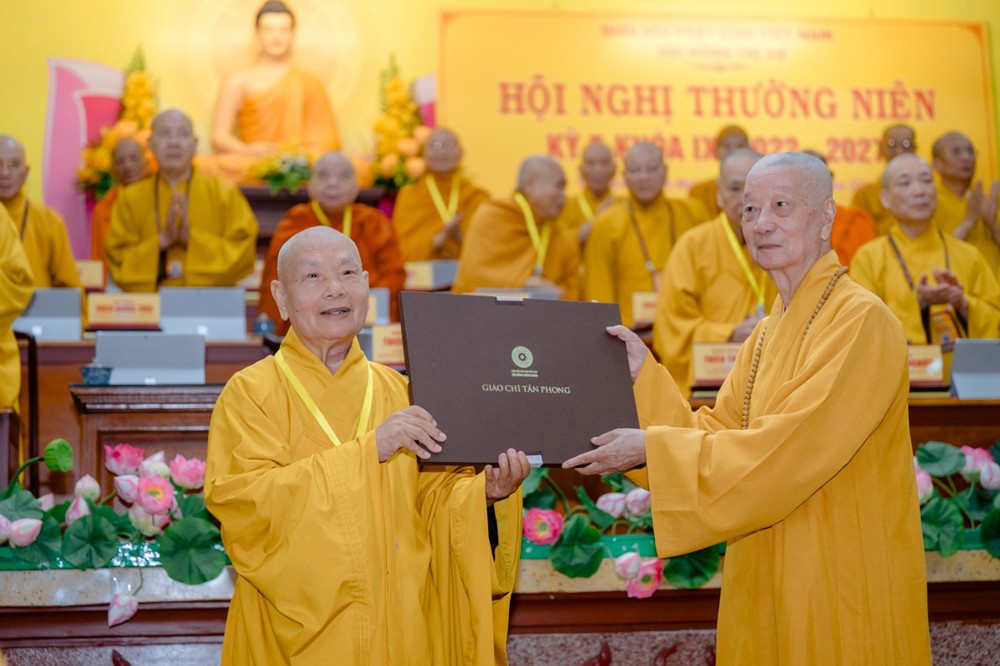 Dịp này, Đức Pháp chủ đã trực tiếp trao Giáo chỉ tấn phong giáo phẩm năm 2025, Trưởng lão Hòa thượng Chủ tịch thay mặt Tăng Ni được tấn phong giáo phẩm năm nay cung kính đón nhận.