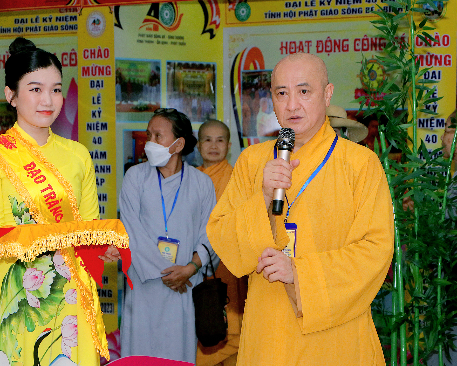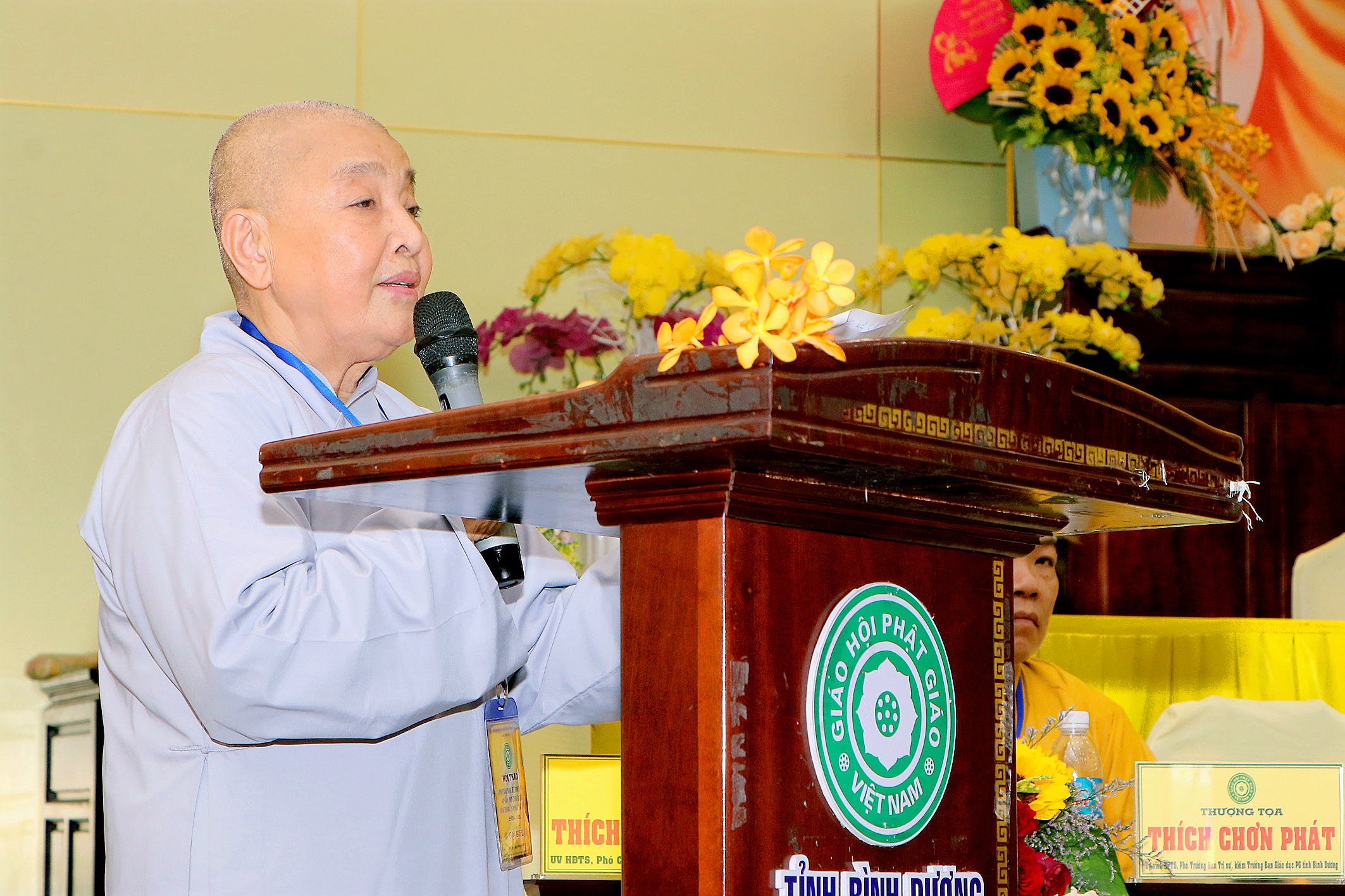 Ban đạo từ tại buổi Hội thảo khoa học, HT. Thích Huệ Thông tán thán tinh thần đóng góp của các học giả trong Hội thảo hôm nay. Qua đó, Hòa thượng nhấn mạnh mục đích của Hội thảo khoa học lần này nhằm làm sáng tỏ quá trình hình thành, phát triển, những bước thăng trầm của Phật giáo trên vùng đất Thủ, cũng như những đóng góp to lớn của Phật giáo Sông Bé - Bình Dương đối với quê hương, đất nước trong tiến trình ổn định và phát triển lịch sử của dân tộc. Hòa thượng cũng mong rằng, đây là dịp để thế hệ hậu bối tri ân công đức của các bậc danh Tăng Phật giáo Việt Nam trong sự nghiệp ổn định và phát triển GHPGVN, góp phần to lớn vào công cuộc thống nhất Phật giáo, tô đậm thêm bản sắc hoà quang đồng trần, gắn bó, đồng hành với dân tộc của Phật giáo Việt Nam.