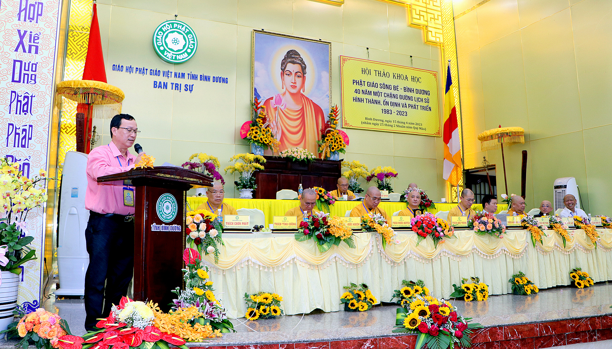 PSO - Nhằm tôn vinh và làm sáng tỏ hơn về công đức và đạo hạnh của chư vị Tiền bối hữu công, cũng như đánh giá một cách khoa học, khách quan về những thành tựu của Phật giáo tỉnh Bình Dương qua 40 năm, sáng nay ngày 15/04/2023, tại Trung tâm Văn hóa tượng Phật Niết bàn - Tổ đình Hội Khánh (P. Phú Cường, TP. Thủ Dầu Một) đã chính thức khai mạc Hội thảo khoa học với chủ đề “Phật giáo Sông Bé – Bình Dương, 40 năm - một chặng đường lịch sử, hình thành và phát triển”, đồng thời khai mạc triển lãm chào mừng kỷ niệm 40 năm thành lập Tỉnh Hội Phật giáo Sông Bé – Bình Dương, thu hút hơn 500 đại biểu đại diện cho Phật giáo và giới nghiên cứu Phật học cả nước tham gia, với hơn 40 tham luận, bài nghiên cứu và các ý kiến.