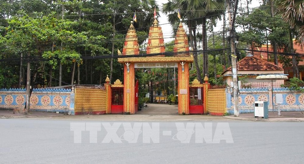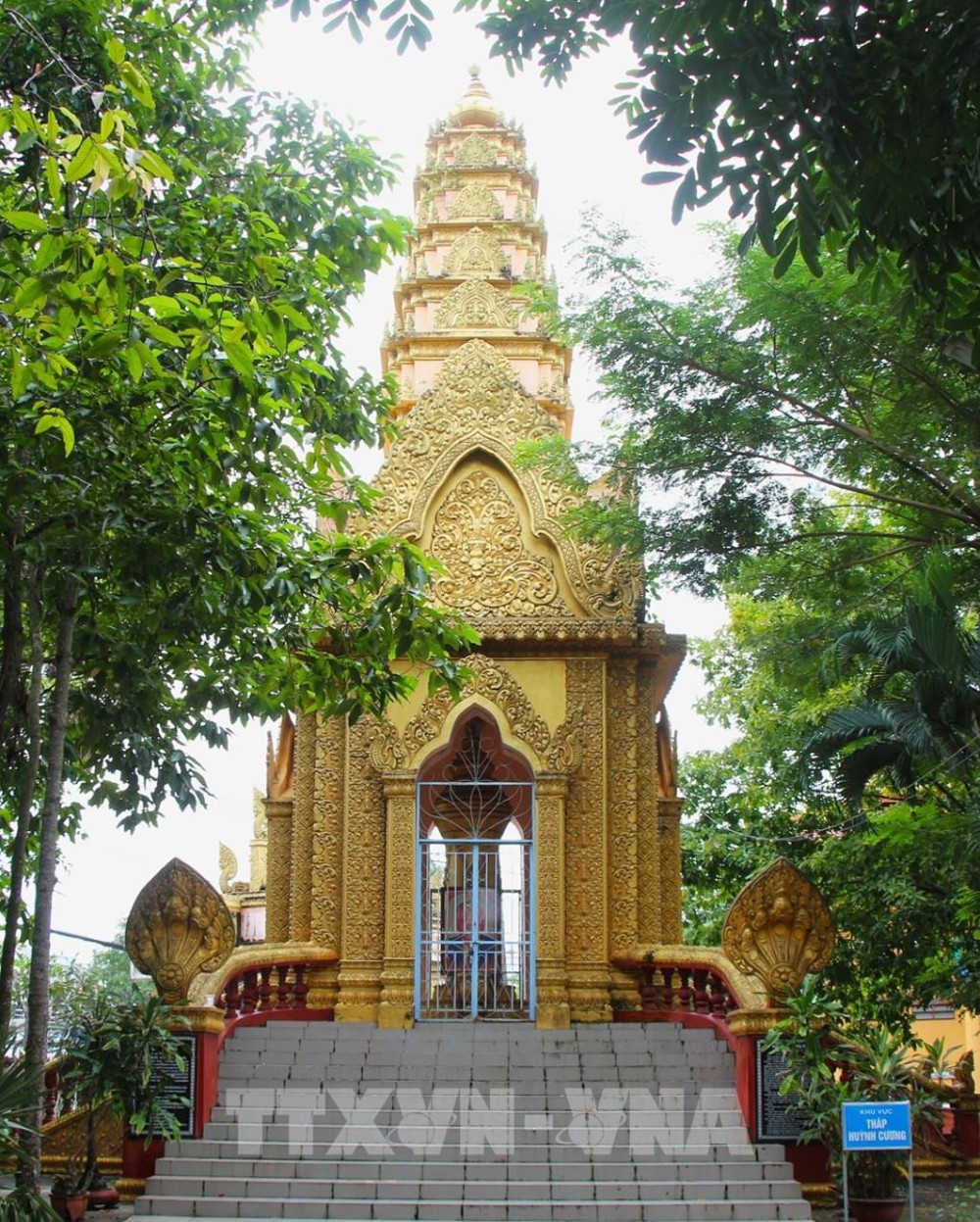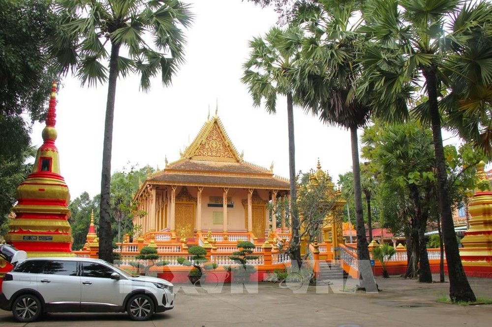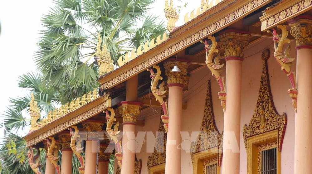 Đặc biệt, sự giao thoa văn hóa thể hiện rõ trong từng chi tiết trang trí: cửa võng mang phong cách người Kinh, các hình cá chép, rồng và chữ Hán đặc trưng người Hoa, hòa quyện hài hòa với nghệ thuật chạm khắc Khmer.
