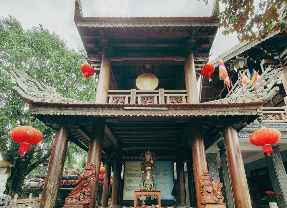 Kiến trúc của chùa là sự giao thoa giữa nhà rường Huế và nhà dài Êđê, kết hợp với nét nhà sàn Tây Nguyên. Từng cột gỗ, mái ngói cong cong, những chi tiết chạm khắc tinh xảo đều toát lên vẻ uy nghiêm nhưng gần gũi. Ngôi chùa quay mặt hướng Tây Nam, phía trước là suối Đốc Học, phía sau tựa lưng vào khu phố, hài hòa theo thế phong thủy “tiền thủy, hậu sơn”.