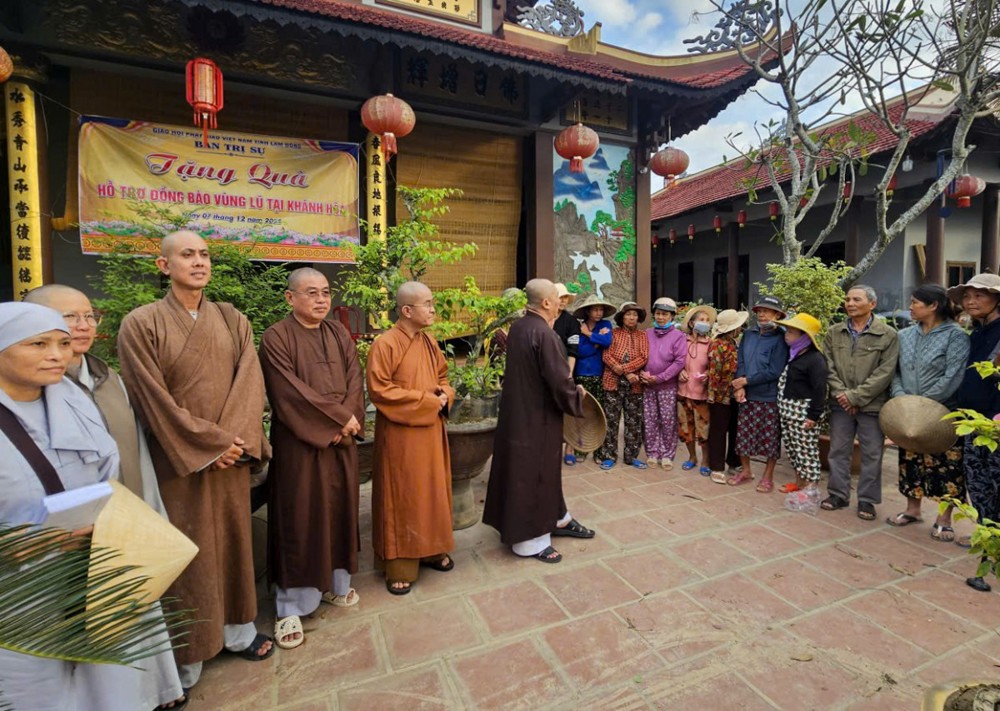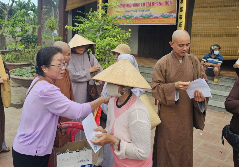 Tại chùa Phước Long (xã Diên Khánh, tỉnh Khánh Hòa), đoàn đã kết hợp cùng Ban Trị sự GHPGVN tỉnh Lâm Đồng trao 300 phần quà tới các hộ dân chịu thiệt hại (trong đó đoàn hỗ trợ 150 phần quà).