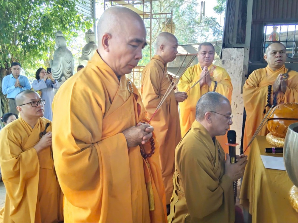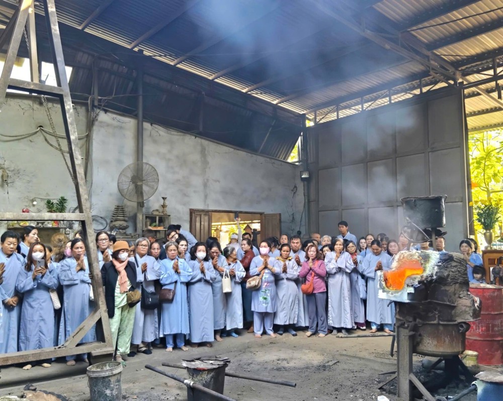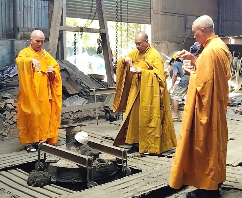 Trong không khí trang nghiêm, thanh tịnh, chư Tôn đức và đại chúng đồng hướng về Tam Bảo, trì tụng Chú Đại Bi, nhất tâm cầu nguyện cho Phật sự được thuận duyên, thành tựu viên mãn. Nghi thức rót đồng được cử hành theo truyền thống Phật giáo, thể hiện tâm nguyện hộ trì Tam Bảo và kiến tạo pháp khí phục vụ sinh hoạt tu học tại tự viện.