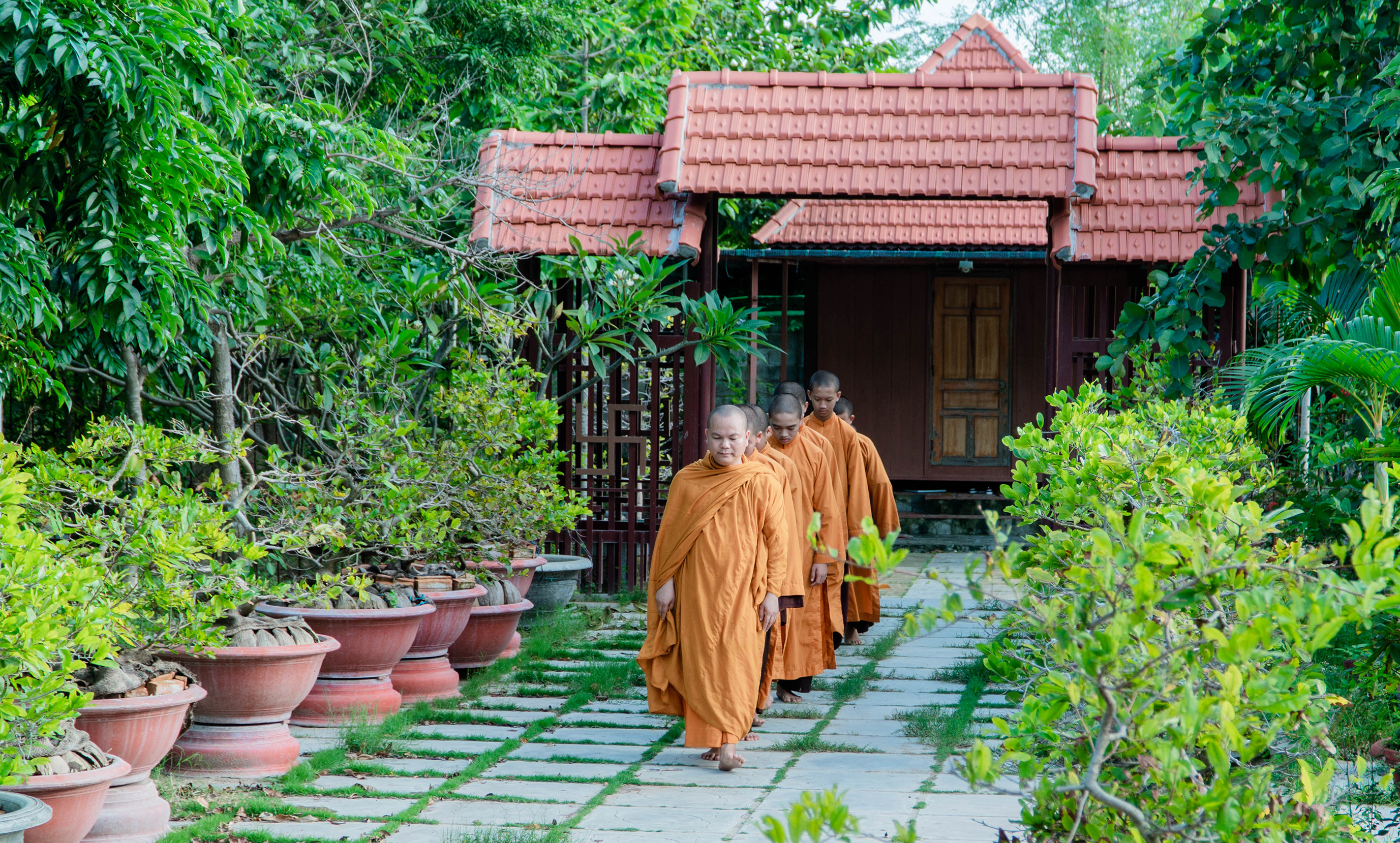 Các Am, Thất nằm xen kẽ giữa vườn cây xanh cổ thụ nối liền các khu vực không gian với nhau là con đường thiền hành mà hàng ngày Thầy trò luôn tu tập Pháp tu thiền.