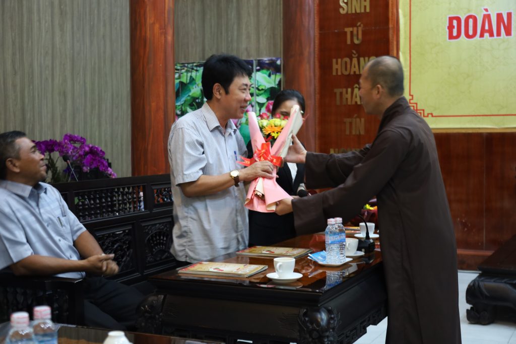 Dịp này, phái đoàn ban Tôn giáo đã gửi phần quà chúc mừng tới chư Tôn đức. Thay mặt chư Tôn đức TT. Thích Minh Nhẫn gửi trao những bó hoa đến quý vị quan khách trong phái đoàn và cùng chụp ảnh lưu niệm.