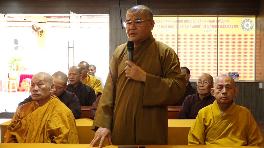 TT. Thích Minh Tiến, đại diện Ban chức sự trường hạ phát biểu thông tin sơ kết về chư Tăng an cư tại chùa Tam Bảo