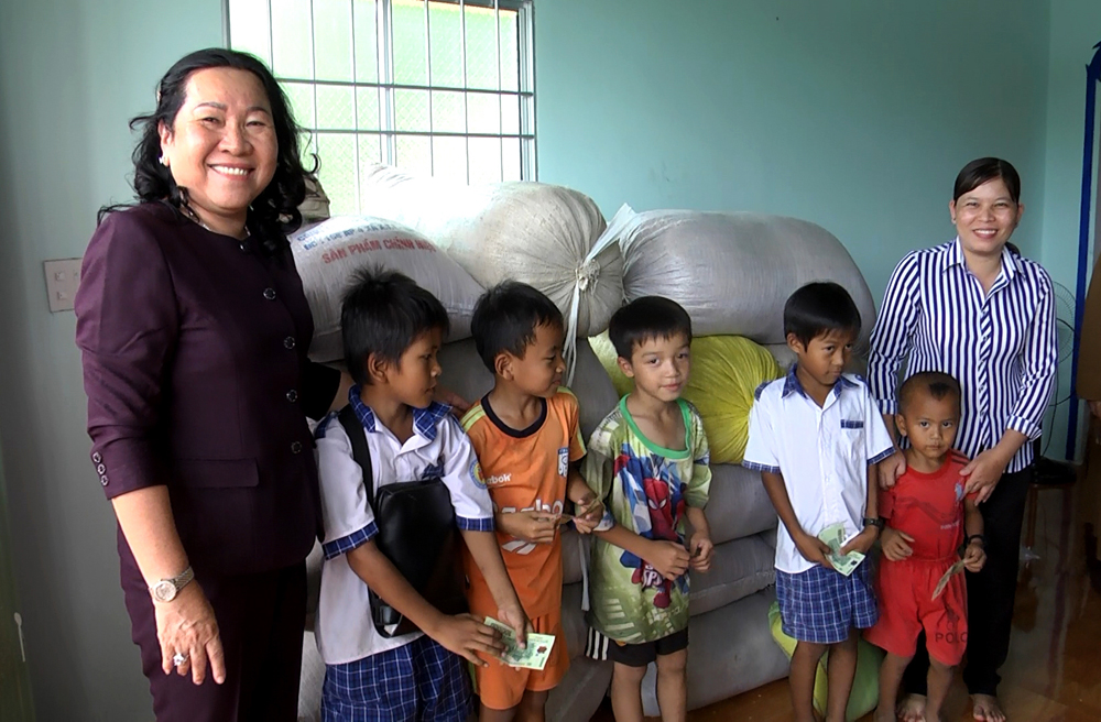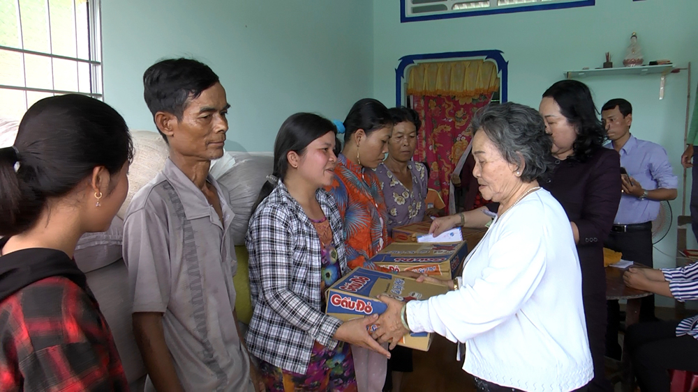 Đi cùng đoàn có bà Châu Cẩm Lệ đại diện công ty Phúc Ngọc. Nhân dịp bàn giao nhà mới, đoàn cũng đã trao mỗi gia đình 1 tượng Phật Bồ Tát Quán Thế Âm và 10 phần quà cho các bà con có hoàn cảnh khó khăn tại địa phương, mỗi phần gồm: 10kg gạo, 1 thùng mì, 10 quyển tập cho học sinh cùng 100.000 VND.