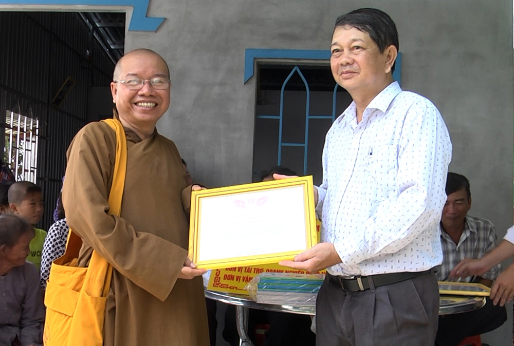 Đại diện chính quyền địa phương, ông Lê Công Đức gửi lời cảm ơn và trao giấy cảm tạ đến GHPGVN tỉnh Kiên Giang cùng Công ty Phúc Ngọc đã vận động và tài trợ xây dựng 02 căn nhà cho bà con, giúp bà con có thêm động lực và ý chí vươn lên trong cuộc sống.