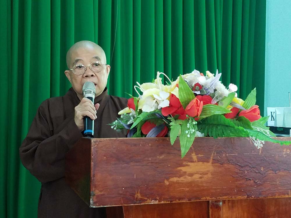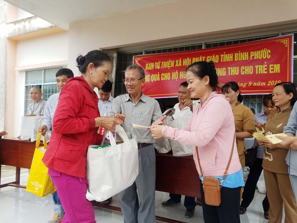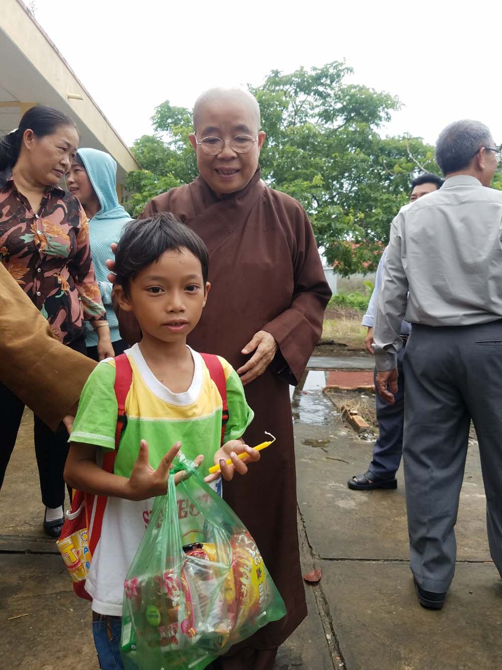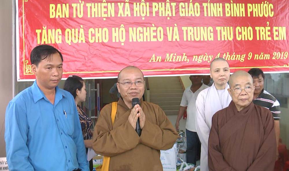 Thay mặt TT. Thích Minh Nhẫn, ĐĐ. Thích Tuệ Giải cũng đã gửi lời cảm ơn sâu sắc đến Ni trưởng, Sư cô và quý Phật tử trong đoàn đã không quản ngại đoạn đường trên 300 cây số để đến thăm hỏi bà con, đó là tấm lòng là nghĩa cử cao đẹp của người con Phật, mong bà con nhận được những phần quà này sẽ cố gắng phấn đấu để có cuộc sống tốt đẹp hơn. Sau đó là phần phát quà, bánh trung thu cho bà con và các em thiếu nhi.
