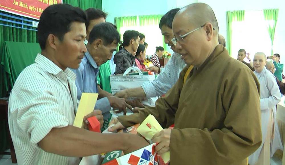 Trước khi buổi phát quà diễn ra, NT. Thích Nữ Nhựt Khương có lời chia sẻ với bà con nhận quà: “ ...nếu không có Phật sự Online và lời kêu gọi từ TT. Thích Minh Nhẫn thì chúng tôi không biết được những khó khăn của bà con ở nơi đây, thiên tai bão lũ thì nơi đâu cũng có không riêng gì Kiên Giang vì thế hôm nay đoàn mới tổ chức về đây. Tất cả những phần quà bé nhỏ đến tay quý vị là những gì chúng tôi quyên góp được từ những Phật tử, mạnh thường quân, tất cả chúng ta gọi là đồng bào. Thật sự quà chúng tôi rất nhỏ, nhưng chúng tôi muốn đến tận nơi trước hết để thăm gặp đồng bào đó là điều quan trọng nhất. Sau khi đến đây thấy được sự ân cần chu đáo của chính quyền địa phương thì bao nhiêu vất vả từ 8 giờ tối hôm qua đến giờ đều tan biến. Cuối cùng tôi xin cảm ơn đến TT. Thích Minh Nhẫn, ĐĐ. Thích Tuệ Giải cùng chư Tôn đức chùa Phật Quang đã sắp xếp, hướng dẫn cho chúng tôi để chúng tôi đến được nơi đây”.