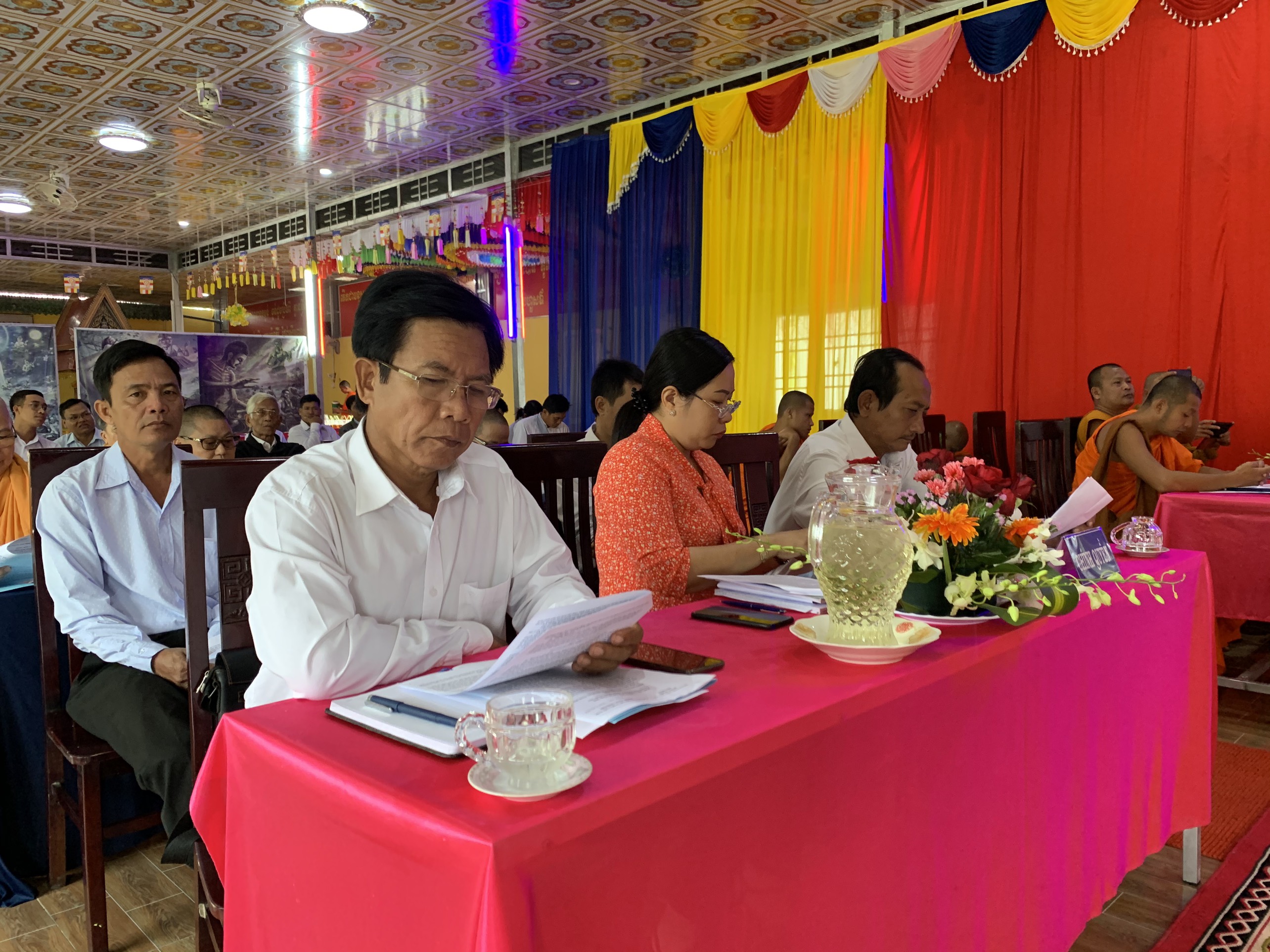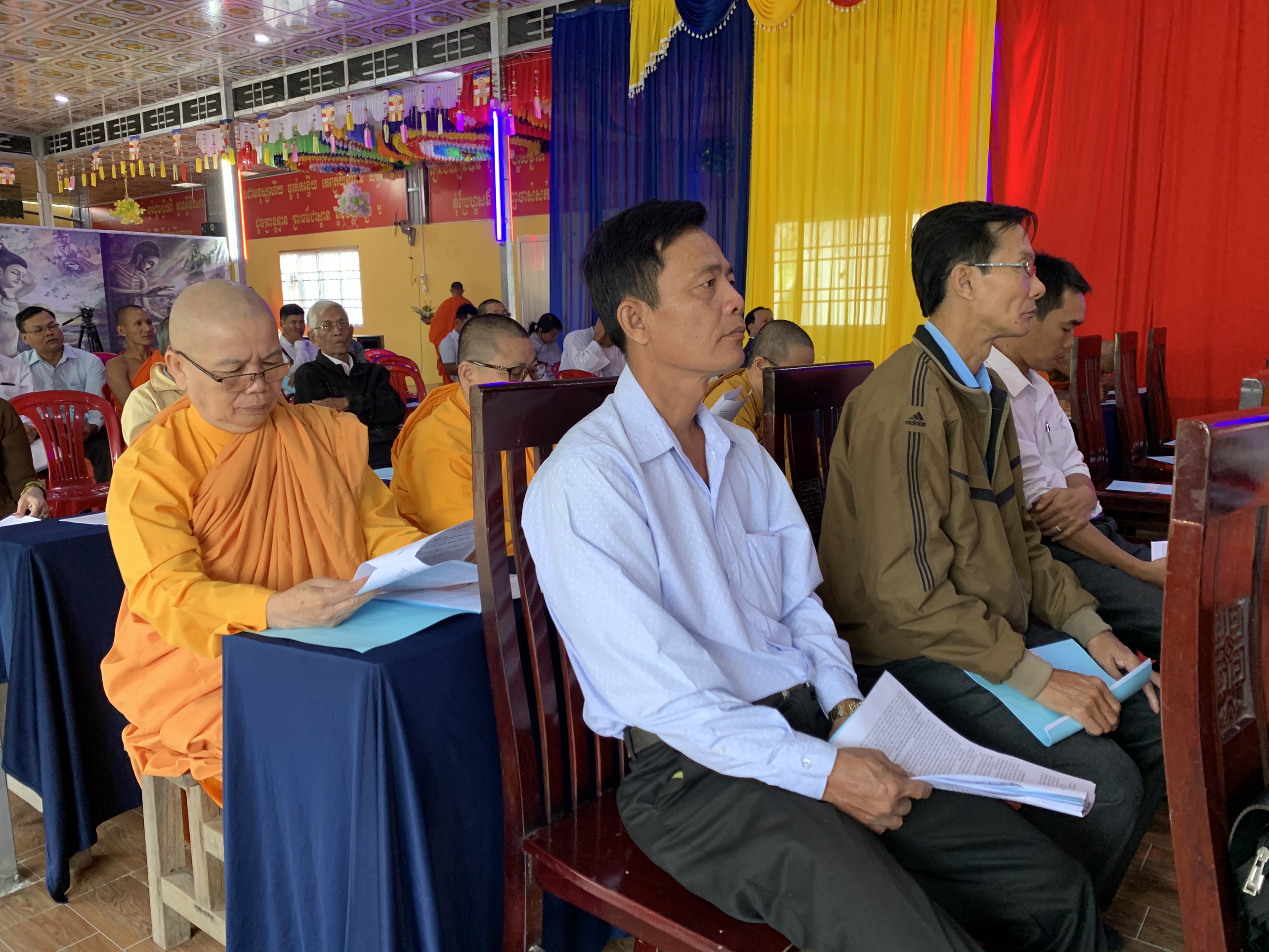 Ông Danh Long – Chánh thư ký Hội ĐKSSYN huyện báo cáo năm 2020 Hội đã thực hiện tốt các chủ chương chính sách của Đảng và tuân thủ pháp luật của Nhà nước. Về công tác giáo dục, hiện tại Thượng tọa Chủ tịch huyện hội đã tốt nghiệp thạc sĩ và Hòa thượng trụ trì chùa Thứ Ba đang nghiên cứu sinh tại trường Đại học Khoa học - Xã hội và Nhân văn TP. HCM. Với các lễ hội truyền thống Hội đã tổ chức các đoàn đi thăm và chúc mừng đến đồng bào có hoàn cảnh khó khăn. Trong năm 2020, do tình hình diễn biến phức tạp của dịch bệnh Covid-19 nên các hoạt động văn nghệ và hội thi của Hội đều tạm hoãn để phòng, tránh dịch bệnh. Hội đã xây dựng, sửa chữa nhà và đến thăm hỏi bà con trong huyện; hỗ trợ áo quan để lo hậu sự cho người quá cố có hoàn cảnh khó khăn; sửa chữa tu bổ chùa và xây dựng cầu đường với tổng giá trị gần 6 tỷ đồng.