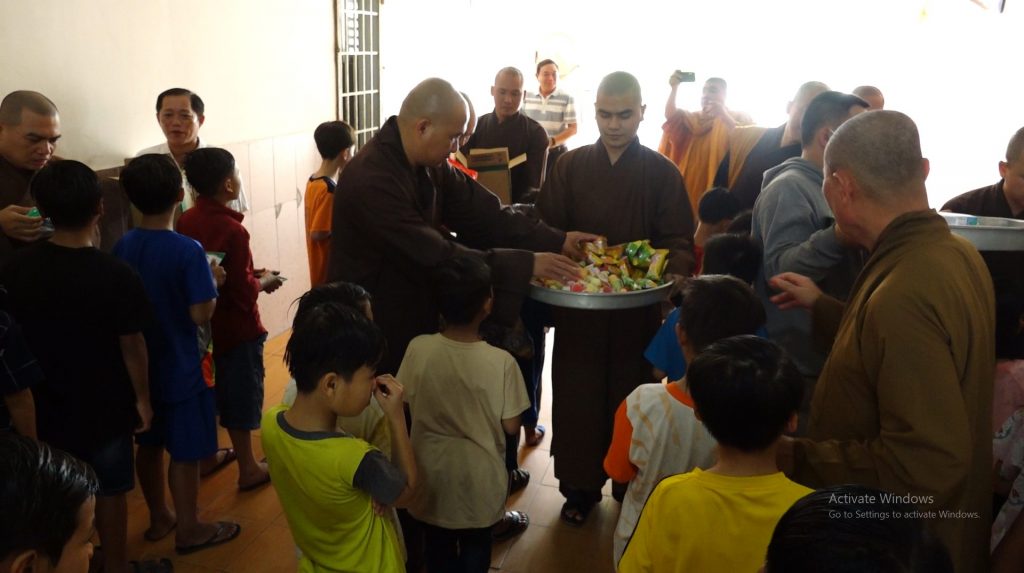 Tại đây, TT. Thích Phước Nguyên thay mặt đoàn có đôi lời thăm hỏi đến các em học sinh và khuyến tấn các em cố gắng, chăm ngoan học giỏi để sau này trở thành người có ích cho xã hội, cho đất nước. Sau lời thăm hỏi Thượng tọa cùng chư Tôn đức trao những phần quà để động viên, khích lệ các em trên con đường học tập.