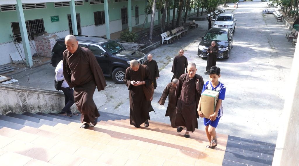 Đại diện Ban Giám đốc Trung Tâm đón tiếp đoàn có TT. Thích Minh Nhẫn – UV HĐTS, Phó trưởng ban Thường trực BTS GHPGVN tỉnh Kiên Giang, Giám đốc Trung tâm Từ thiện Xã hội Phật Quang và các thầy cô, nhân viên thường trực Trung tâm.