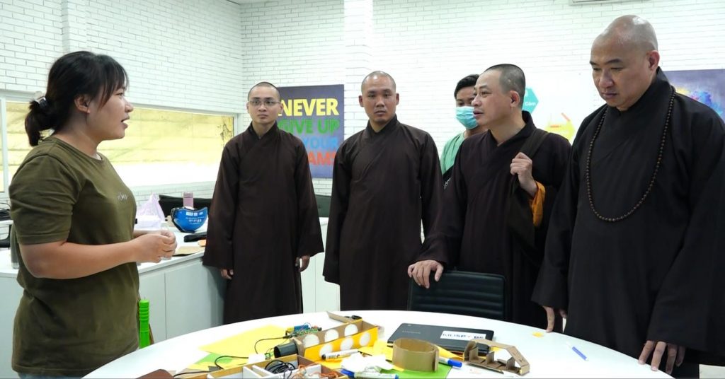 Sau đó, chư Tôn đức trong đoàn đã tham quan các công trình phục vụ tại Trung tâm như: Phòng học, nhà ăn, phòng ngủ, nơi sinh hoạt, phòng học công nghệ robot và ngoại ngữ của các em học sinh tại Trung tâm.