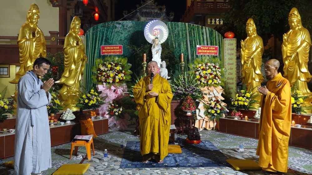 Mở đầu chương trình chư Tôn đức cùng toàn thể đạo tràng niêm hương đảnh lễ Tam bảo. Sau đó, Đại đức trụ trì cử hành nghi thức sái tịnh, toàn thể hội chúng nhất tâm trì tụng Đại bi tâm chú, phụng thỉnh 12 tôn tượng Bồ tát Quan Thế Âm an vị và hồi hướng công đức cầu nguyện cho thế giới hòa bình, quốc thái dân an, chúng sanh an lạc.