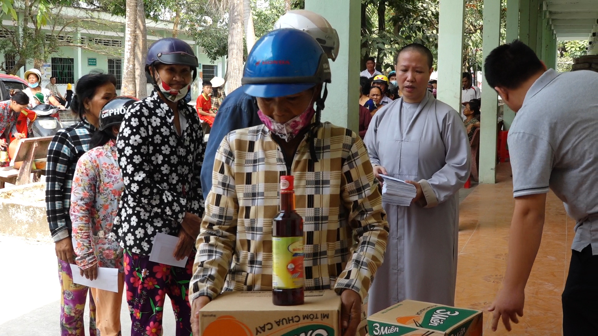 Tại đây, đoàn đã trao 200 phần quà gồm: 10kg gạo, 1 thùng mì tôm, nước mắm và 1 bao lì xì. Trong đó nước mắm được ĐĐ.Thích Tuệ Giải - Phó Thư ký kiêm Chánh Văn phòng BTS, Trưởng ban Thông tin Truyền thông (TT-TT) GHPGVN tỉnh Kiên Giang, Phó Giám đốc Trung tâm tặng kèm. Những phần quà nhằm hỗ trợ cho bà con hoàn cảnh khó khăn đang sinh sống tại khu vực gần Trung tâm TTXH Phật Quang, giúp bà con đón Tết được thêm phần ấm cúng.