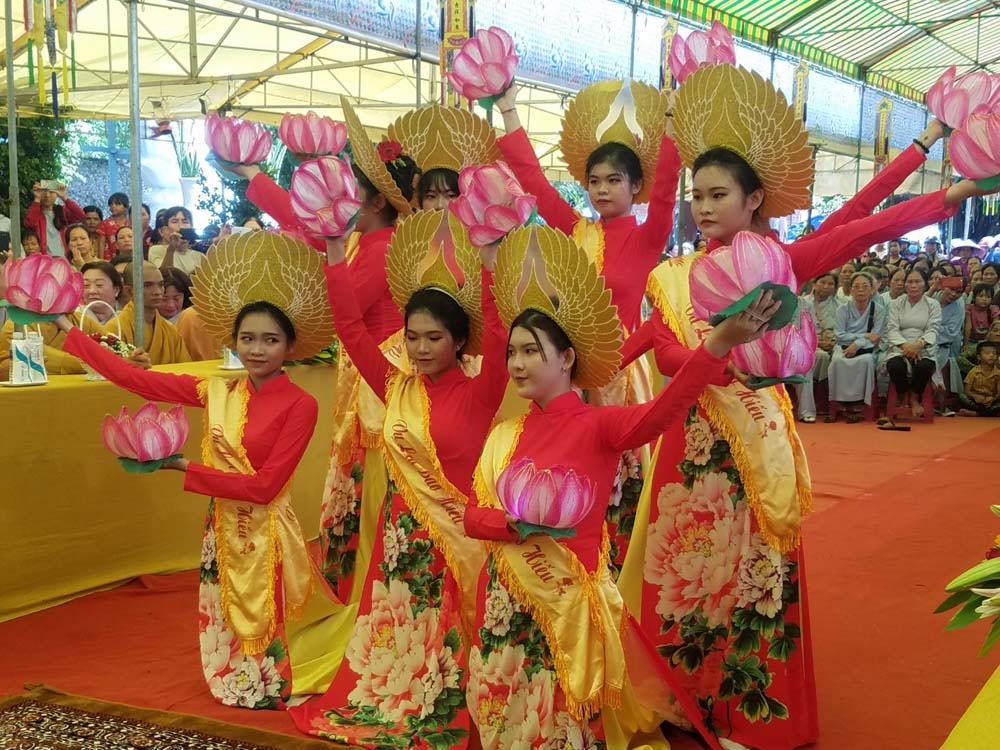 Bước vào buổi lễ là nghi thức múa dâng hoa của các em Phật tử chùa Phật Quang Chánh Giác dâng lên cúng dường khánh tuế chư Tôn đức thêm một tuổi đạo.